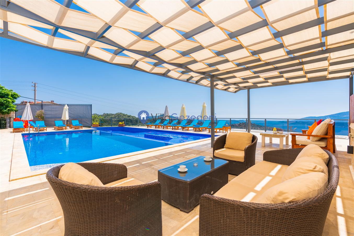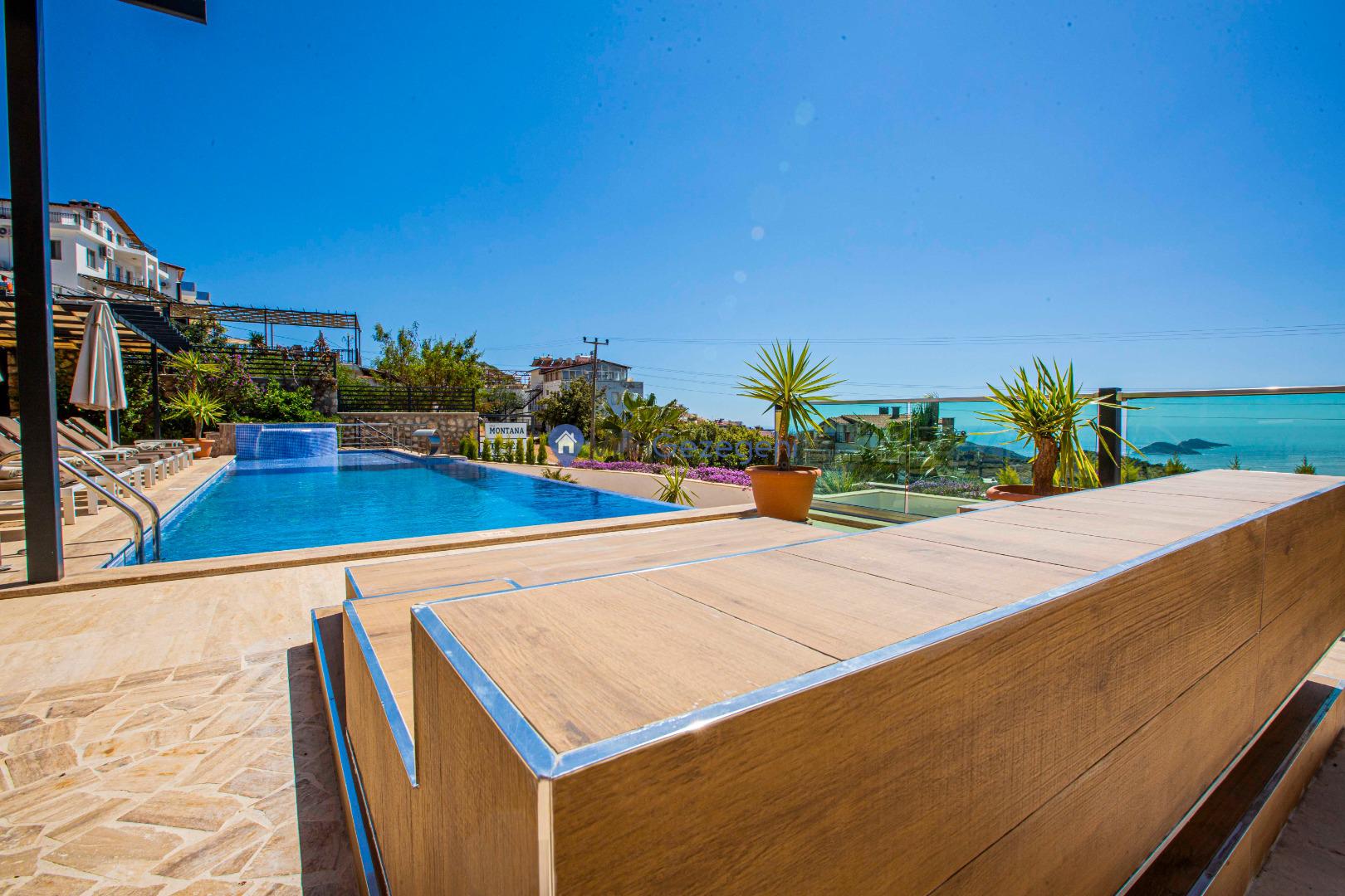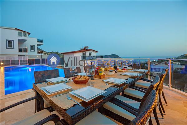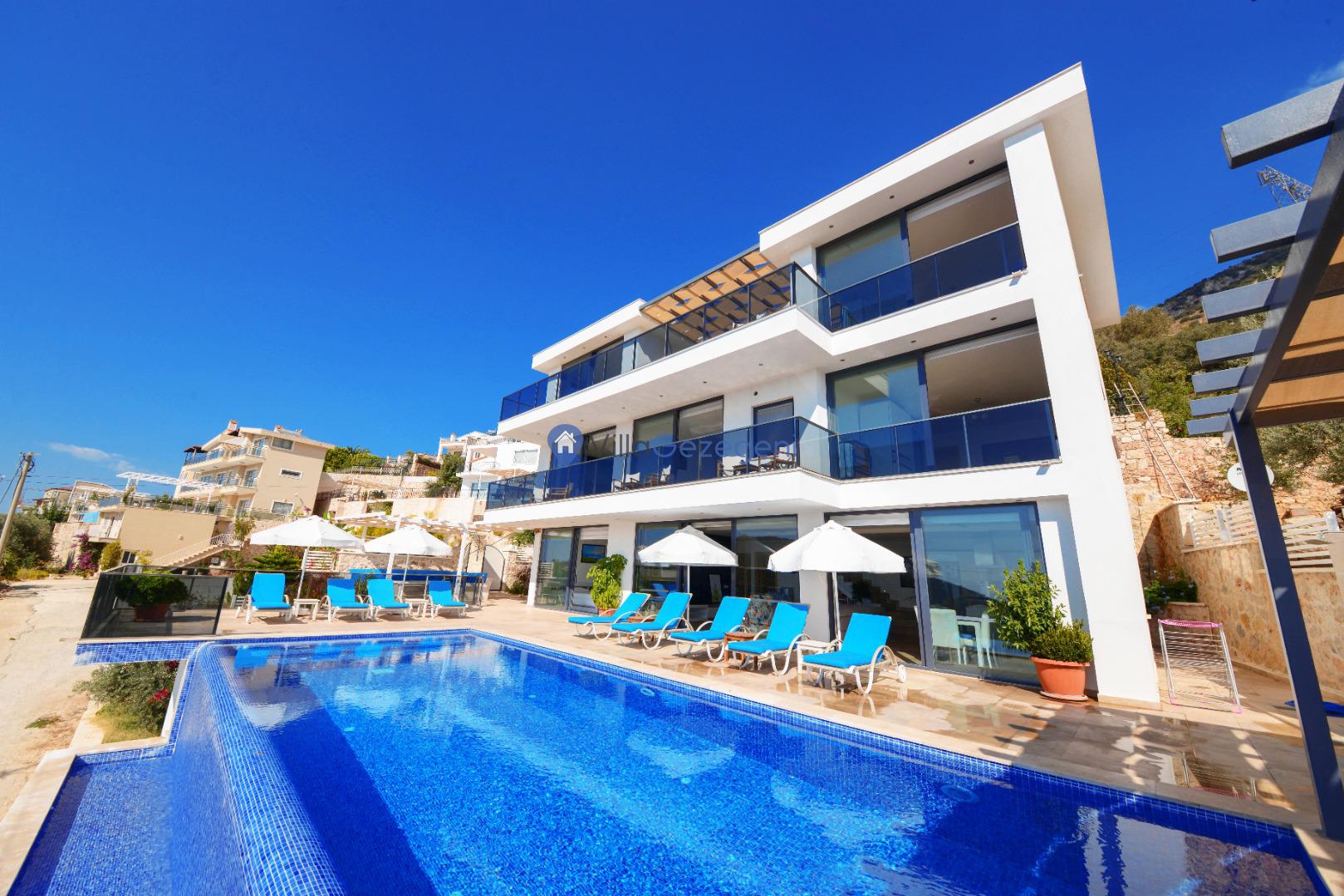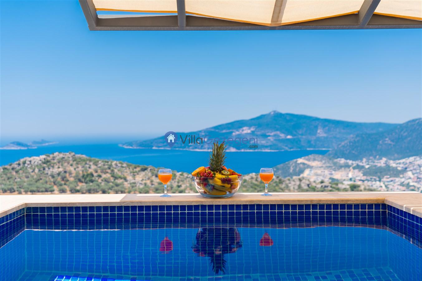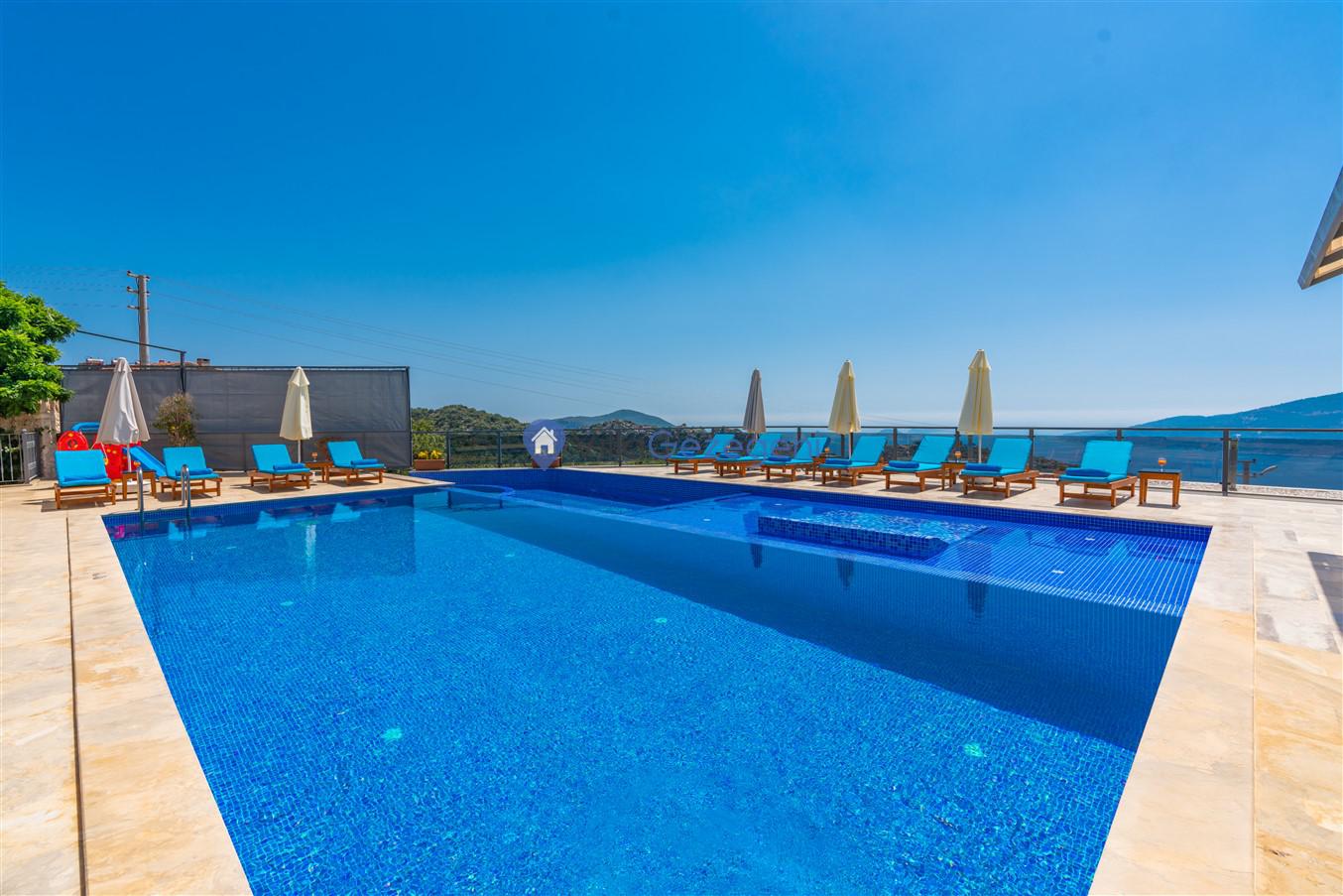 Villa Ela, Kalkan Akbel'de 12 kişilik, lüks, deniz manzaralı, jakuzili, ısıtmalı havuzlu, markete yakın, kiralık geniş aile ve arkadaş grubu villası.