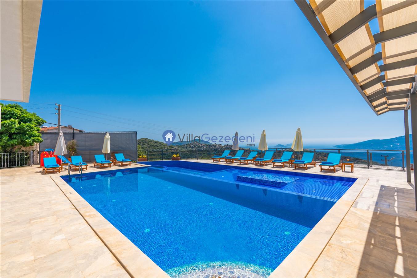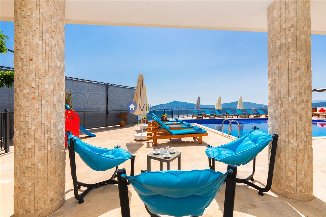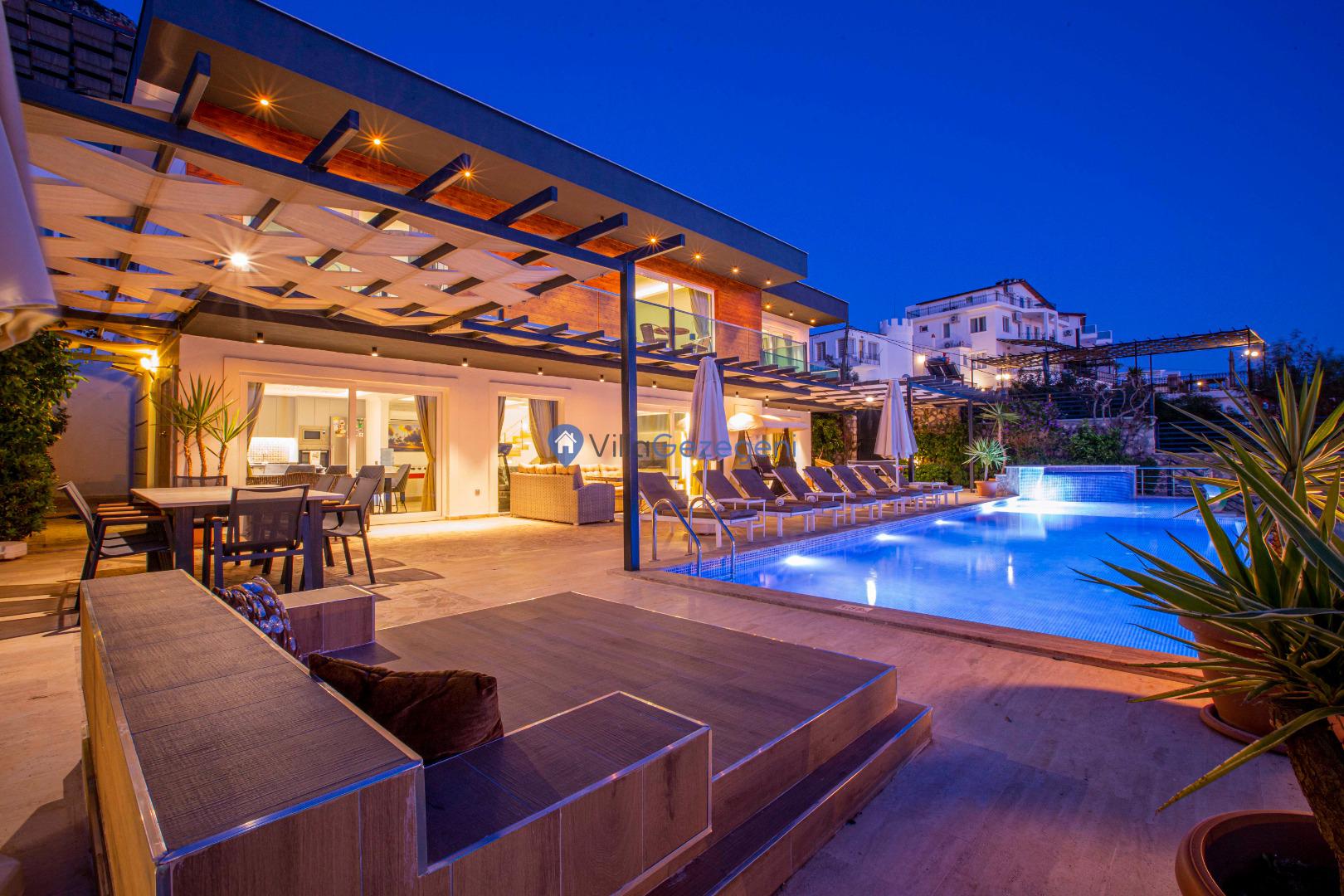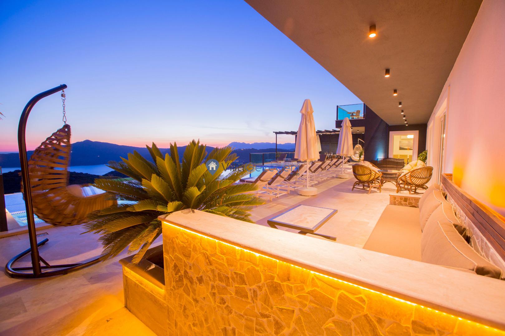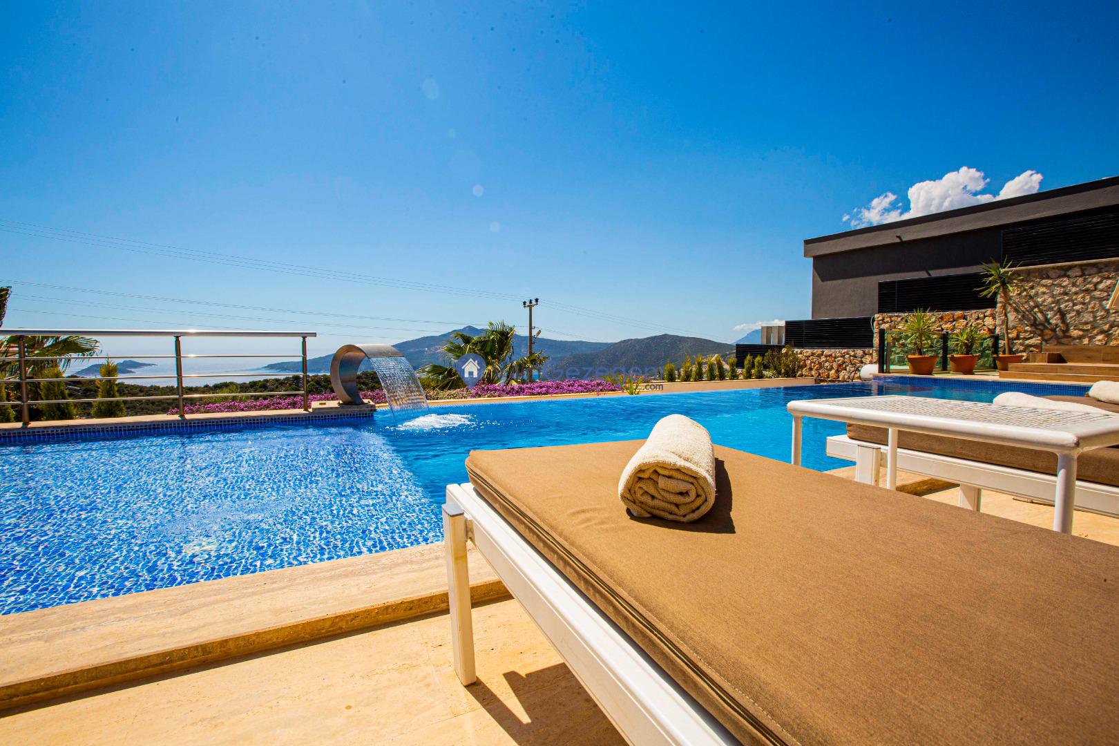 Villa Ela, Kalkan Akbel'de 12 kişilik, lüks, deniz manzaralı, jakuzili, ısıtmalı havuzlu, markete yakın, kiralık geniş aile ve arkadaş grubu villası.