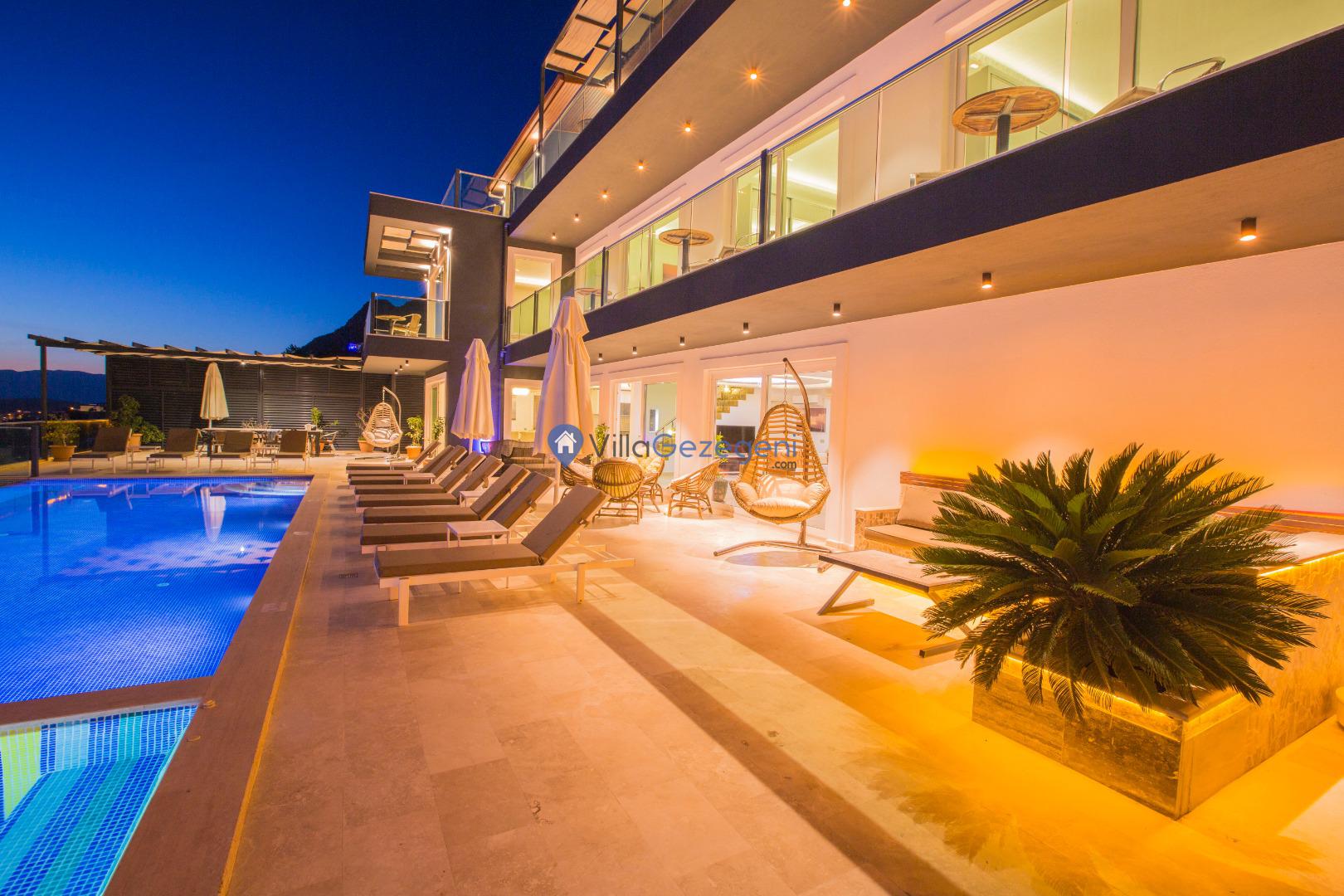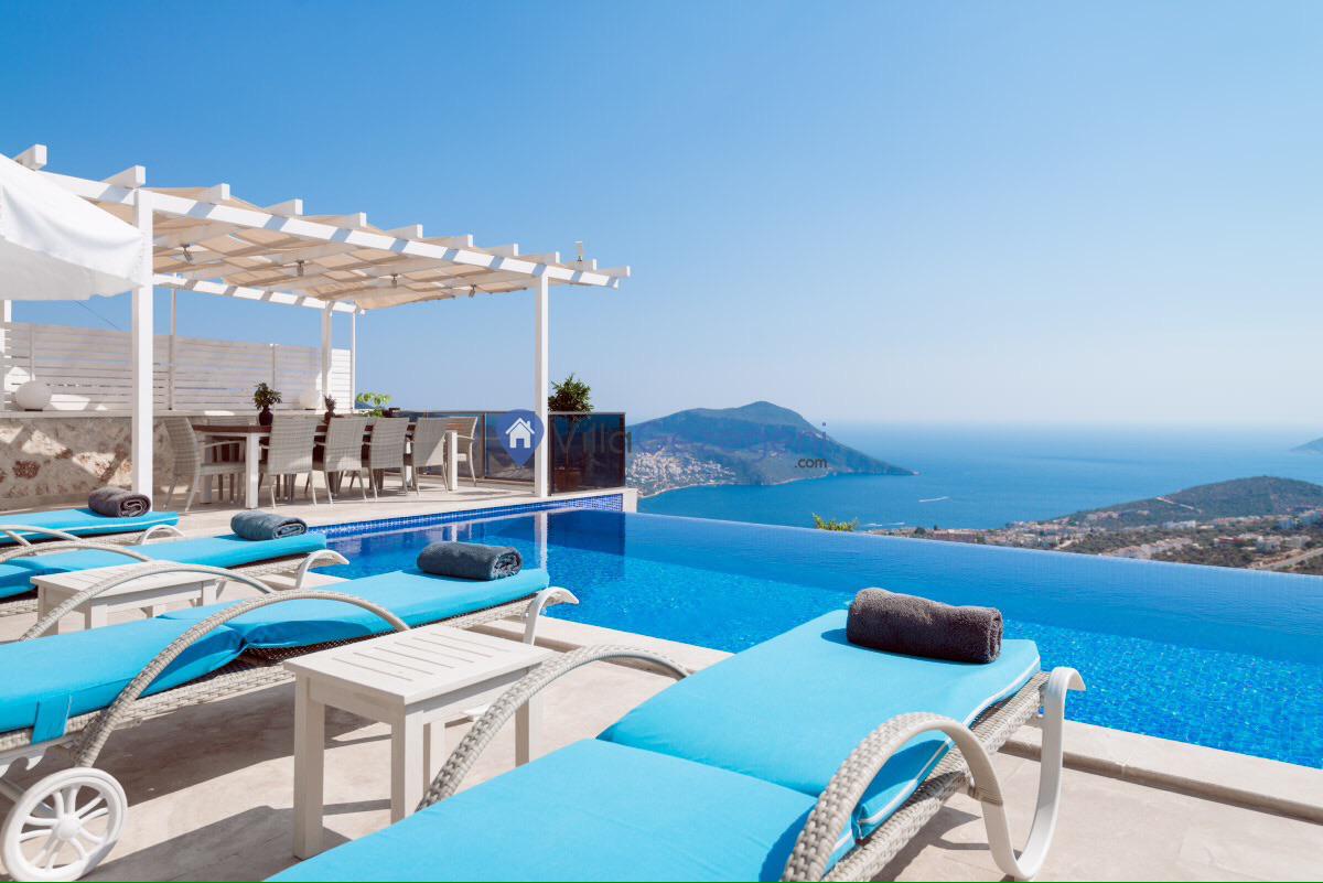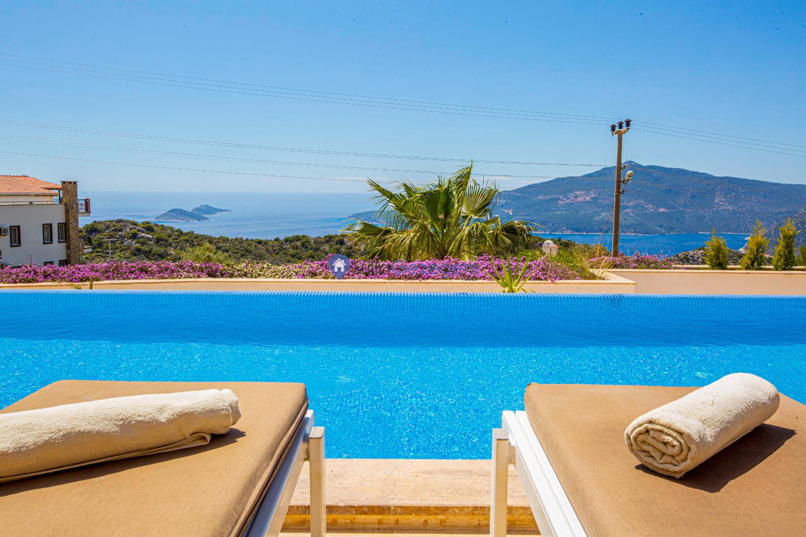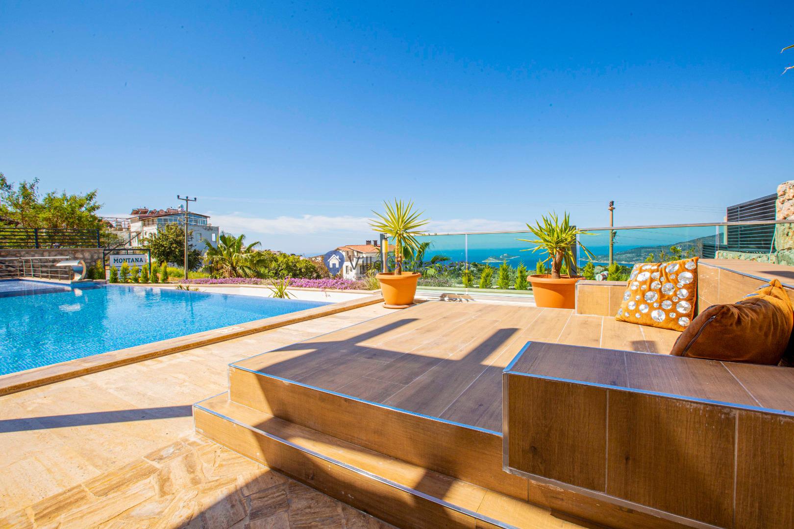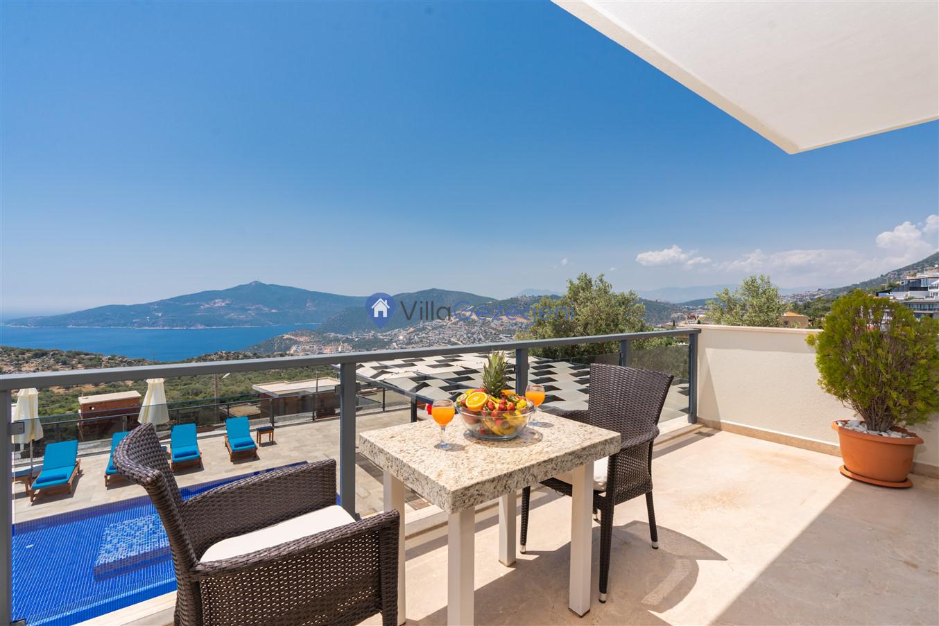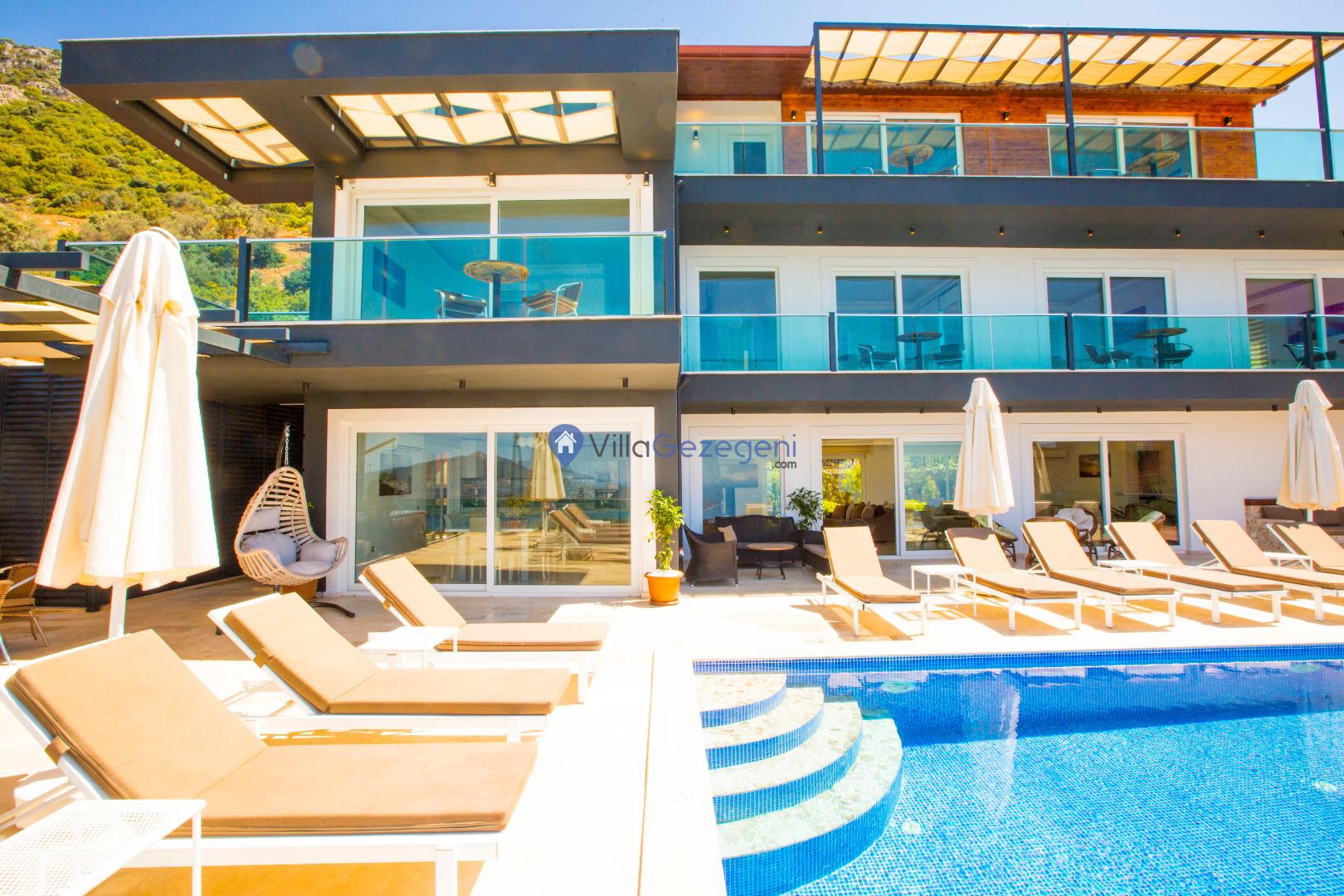 Villa Ela, Kalkan Akbel'de 12 kişilik, lüks, deniz manzaralı, jakuzili, ısıtmalı havuzlu, markete yakın, kiralık geniş aile ve arkadaş grubu villası.