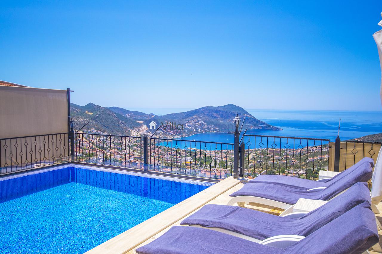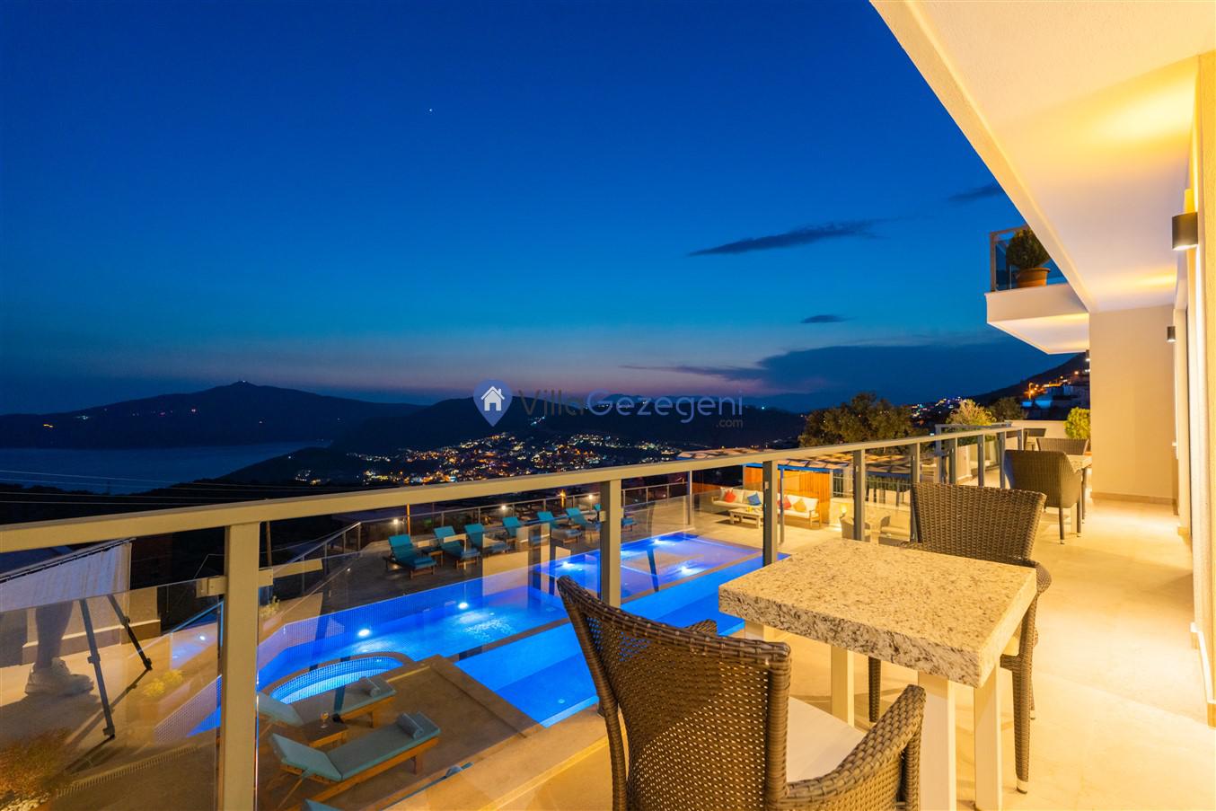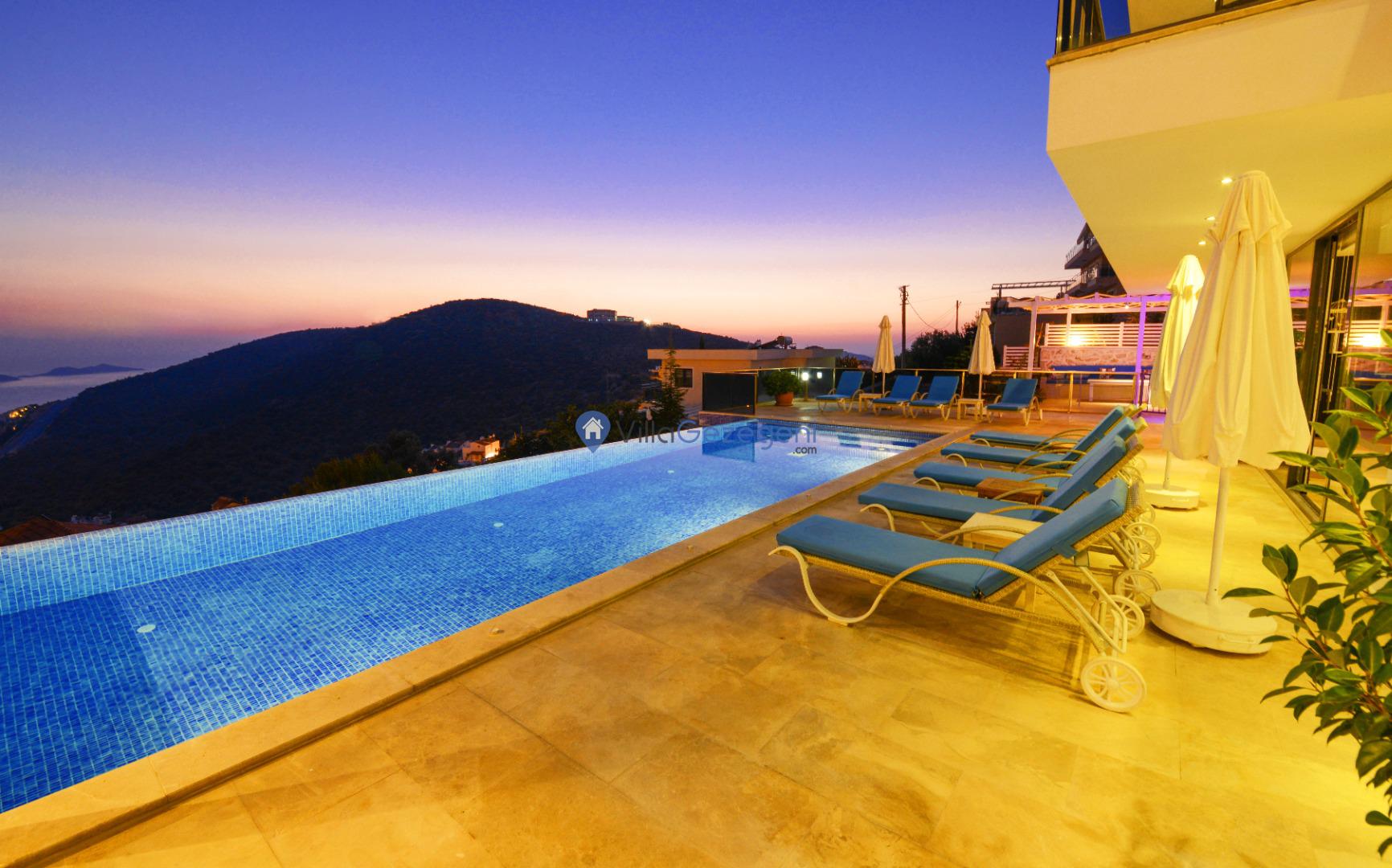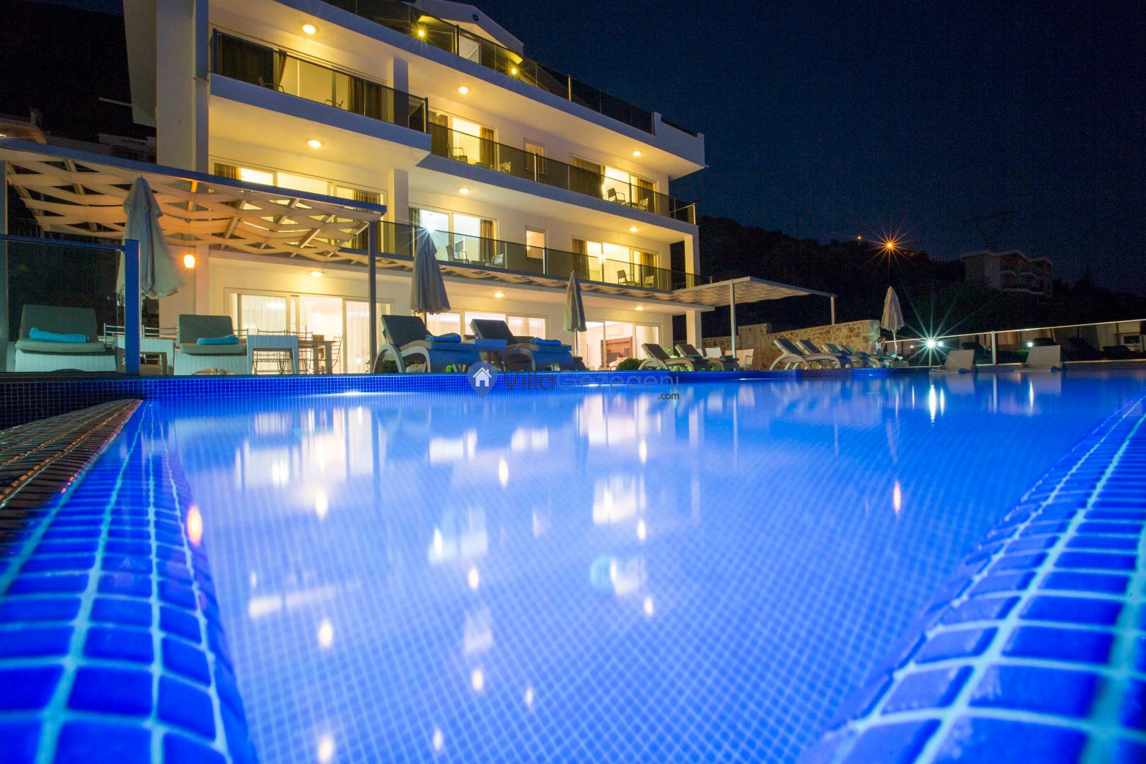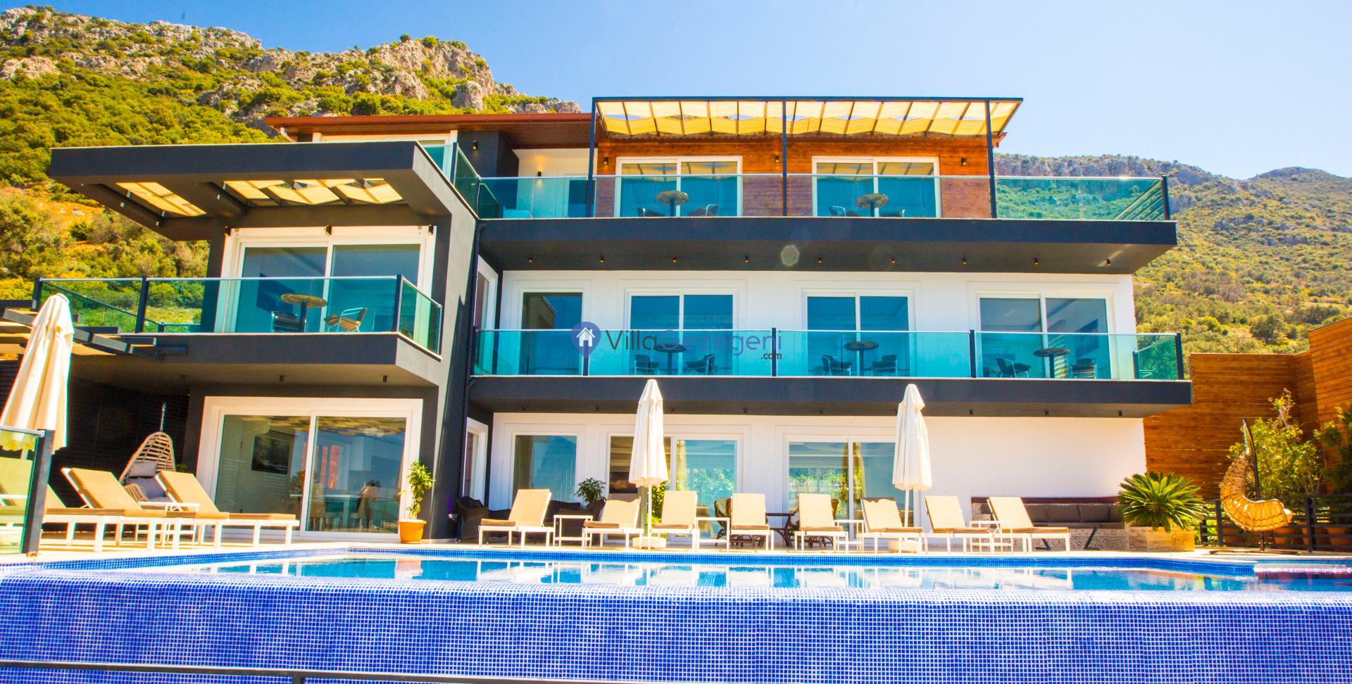 Villa Ela, Kalkan Akbel'de 12 kişilik, lüks, deniz manzaralı, jakuzili, ısıtmalı havuzlu, markete yakın, kiralık geniş aile ve arkadaş grubu villası.