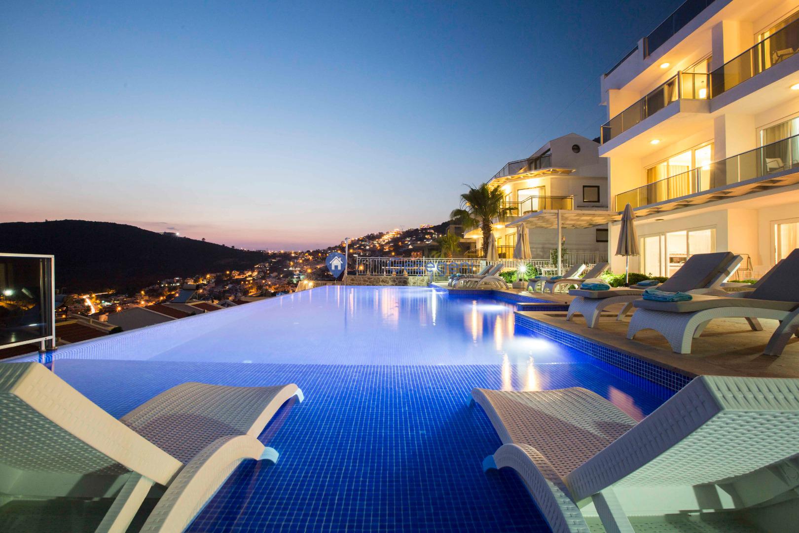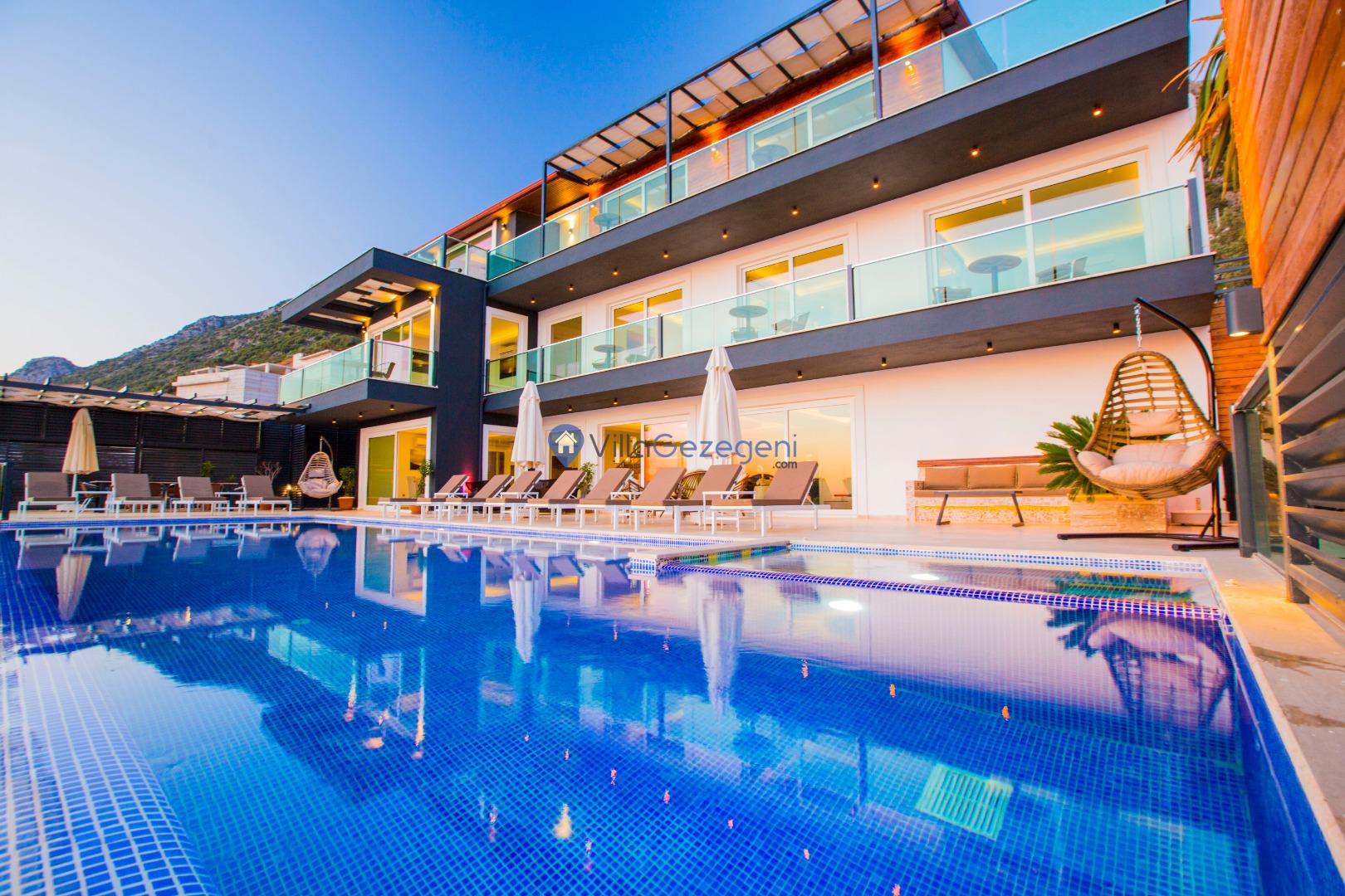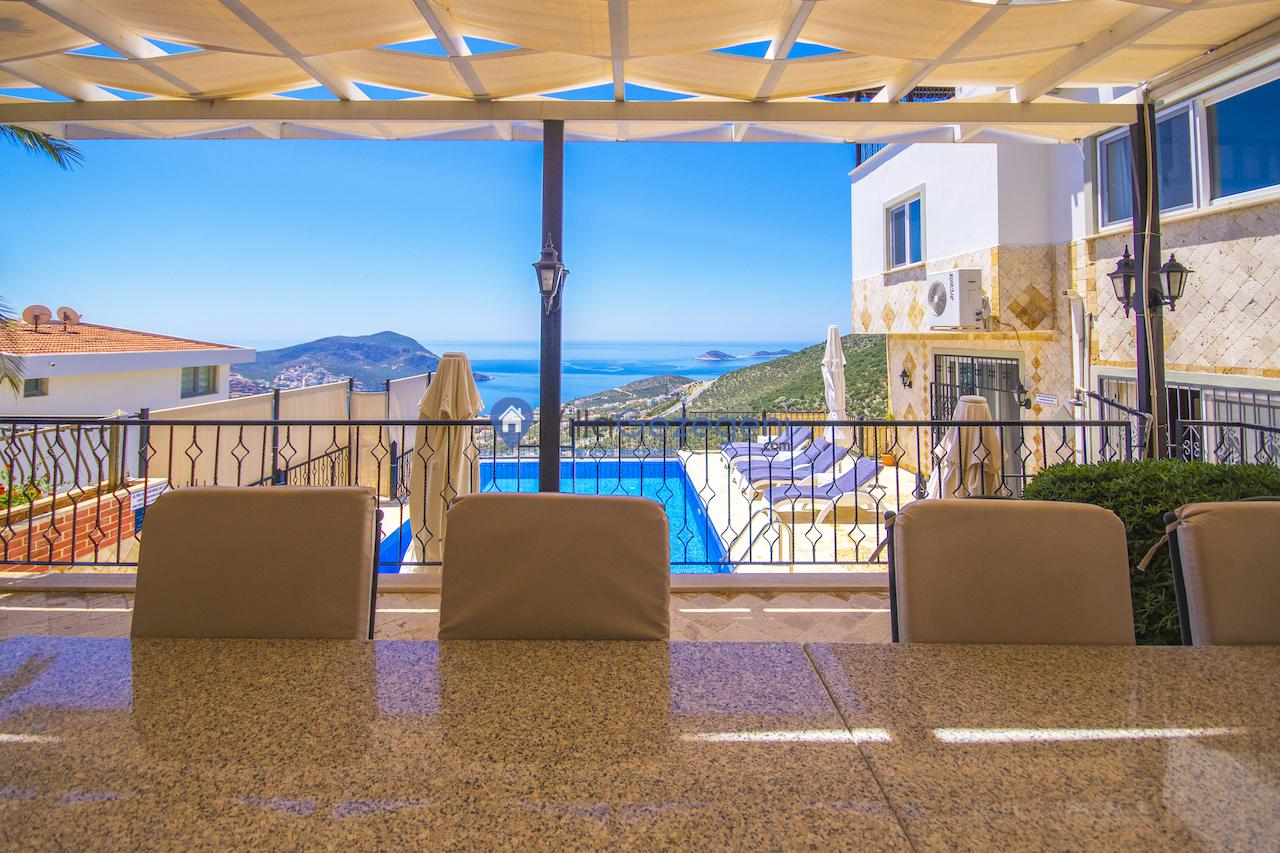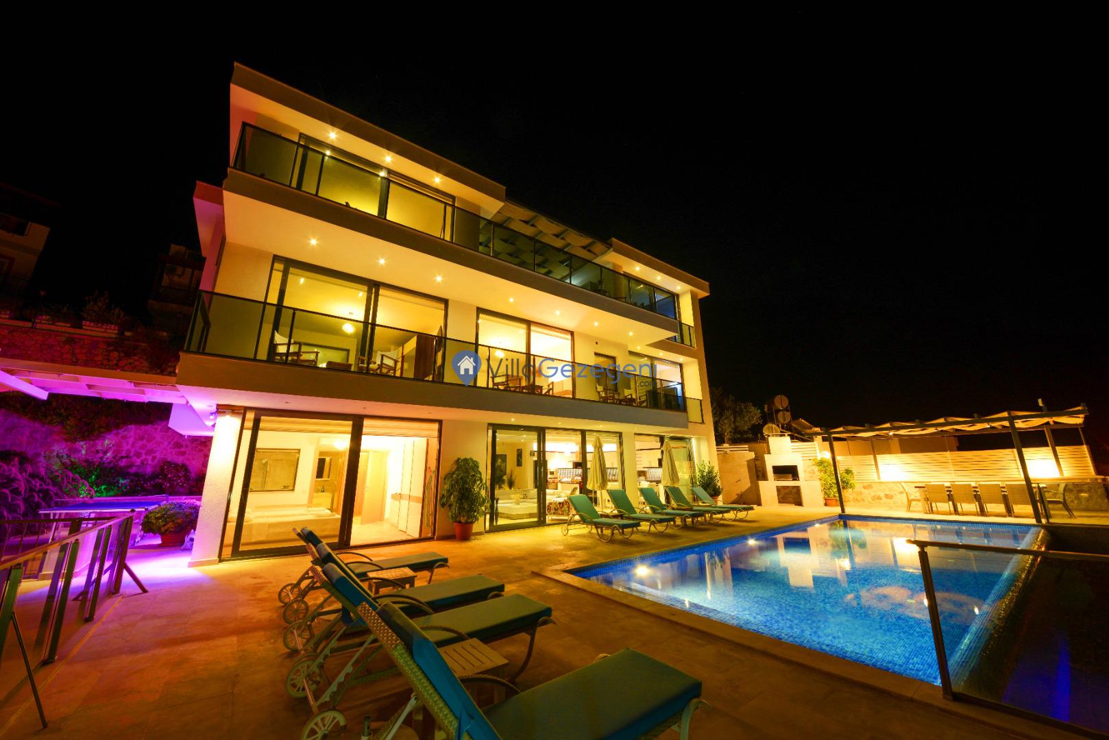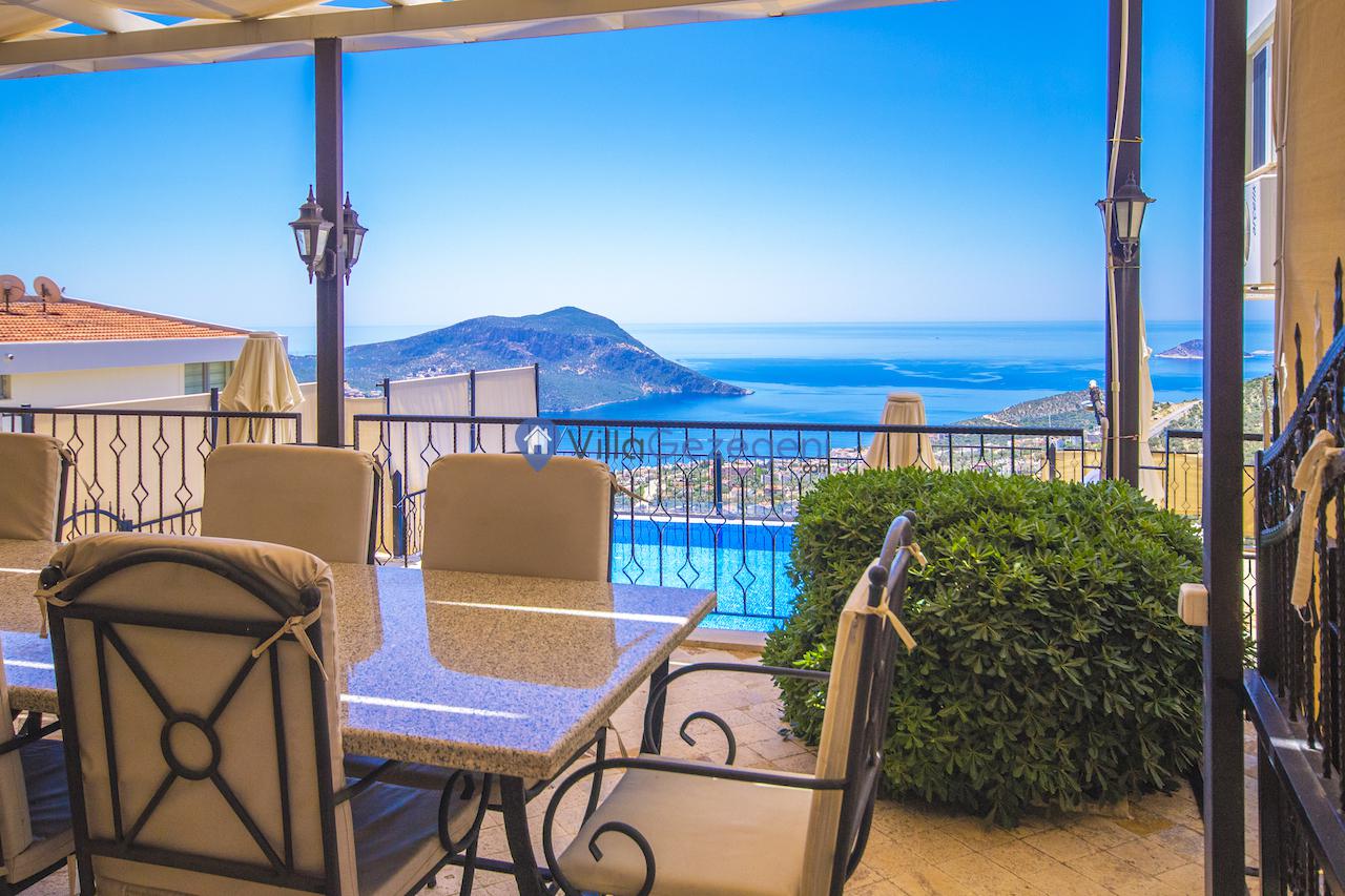 Villa Ela, Kalkan Akbel'de 12 kişilik, lüks, deniz manzaralı, jakuzili, ısıtmalı havuzlu, markete yakın, kiralık geniş aile ve arkadaş grubu villası.