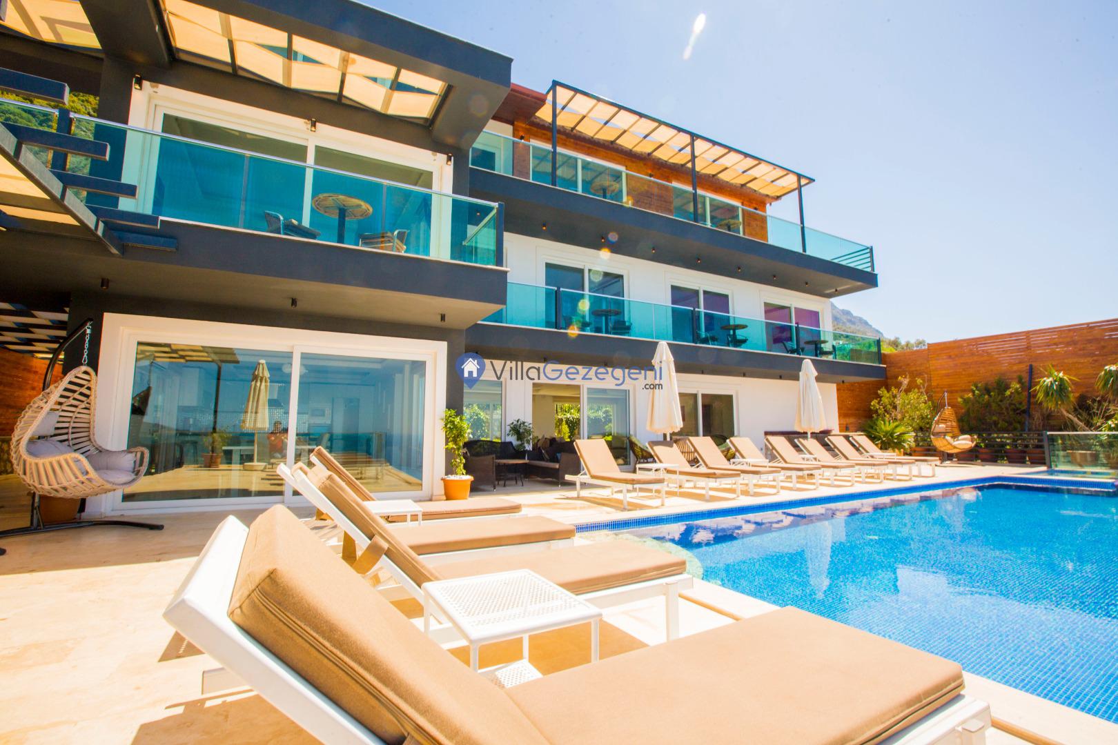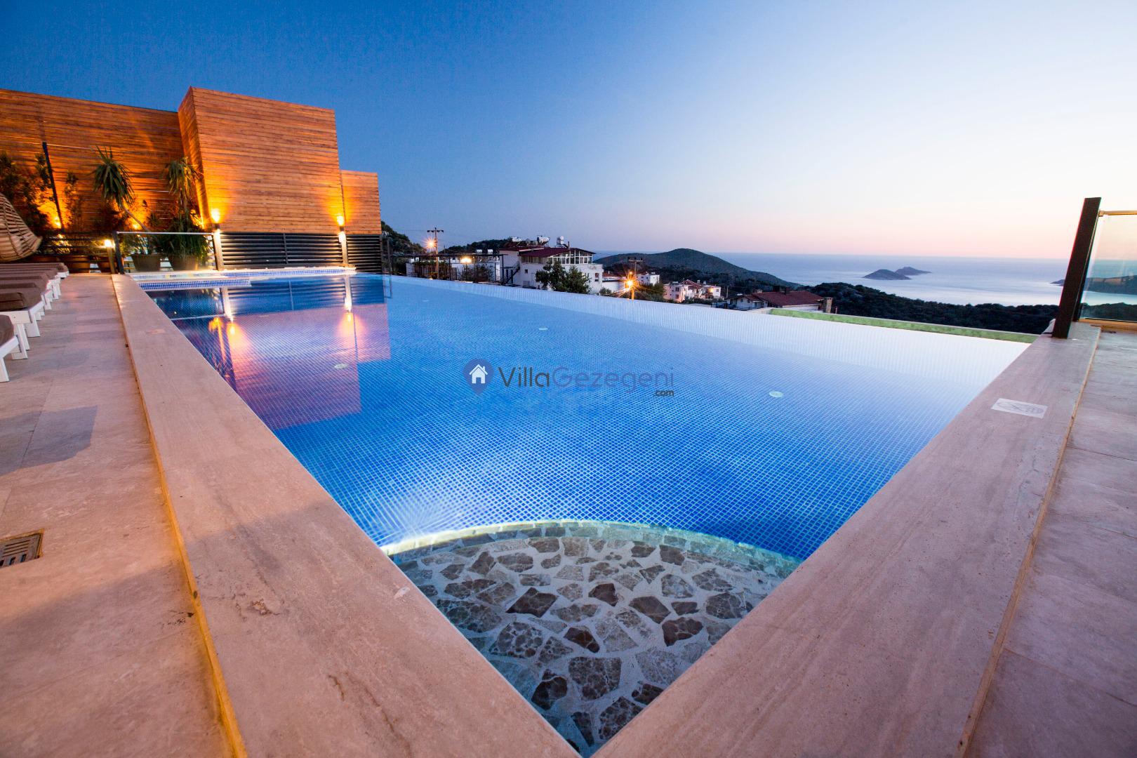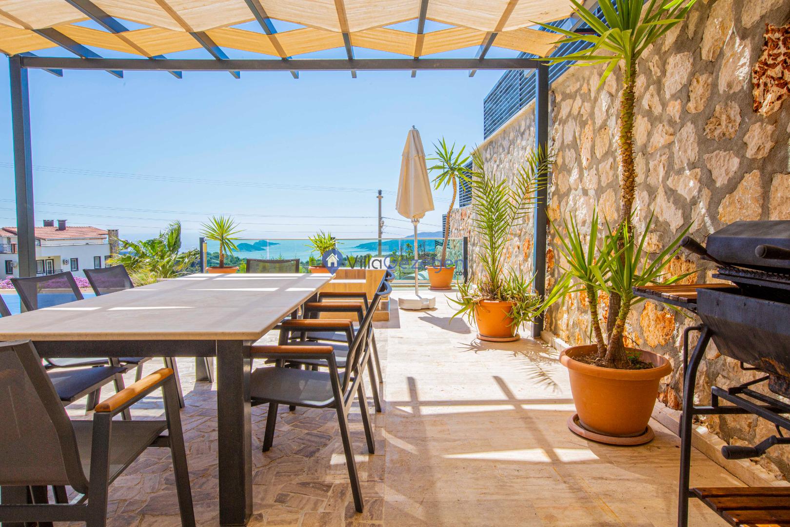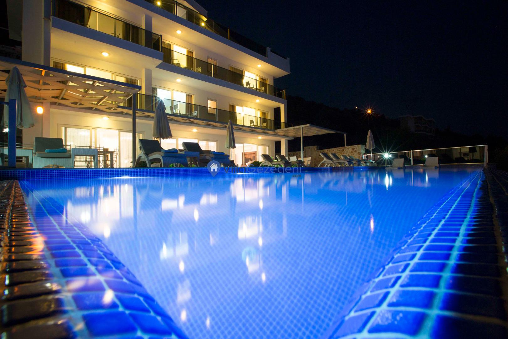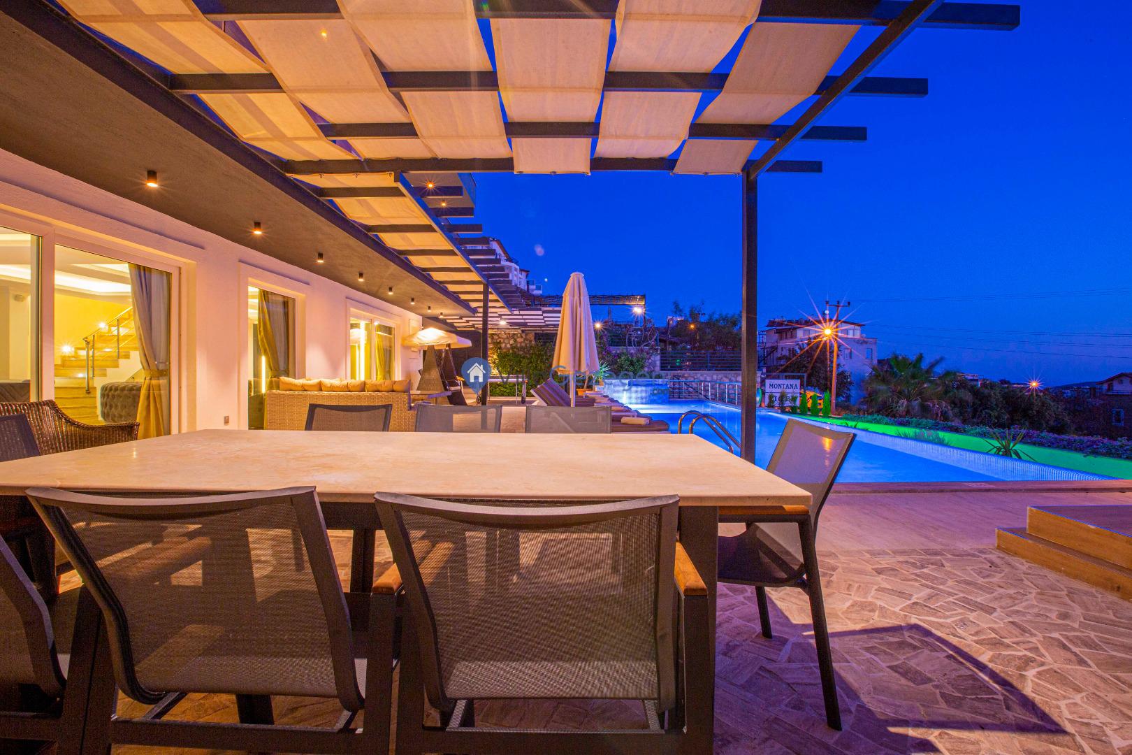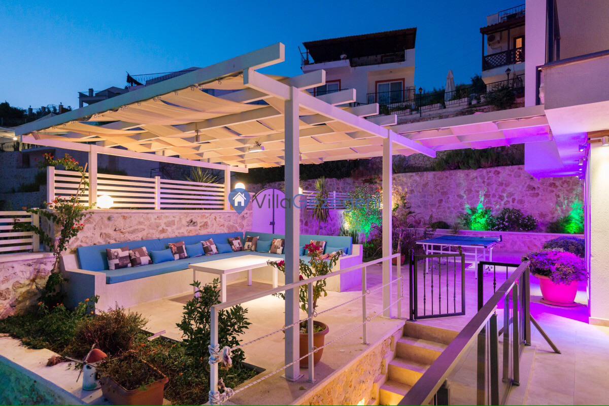 Villa Ela, Kalkan Akbel'de 12 kişilik, lüks, deniz manzaralı, jakuzili, ısıtmalı havuzlu, markete yakın, kiralık geniş aile ve arkadaş grubu villası.
