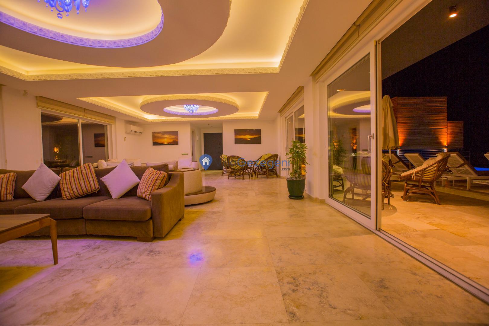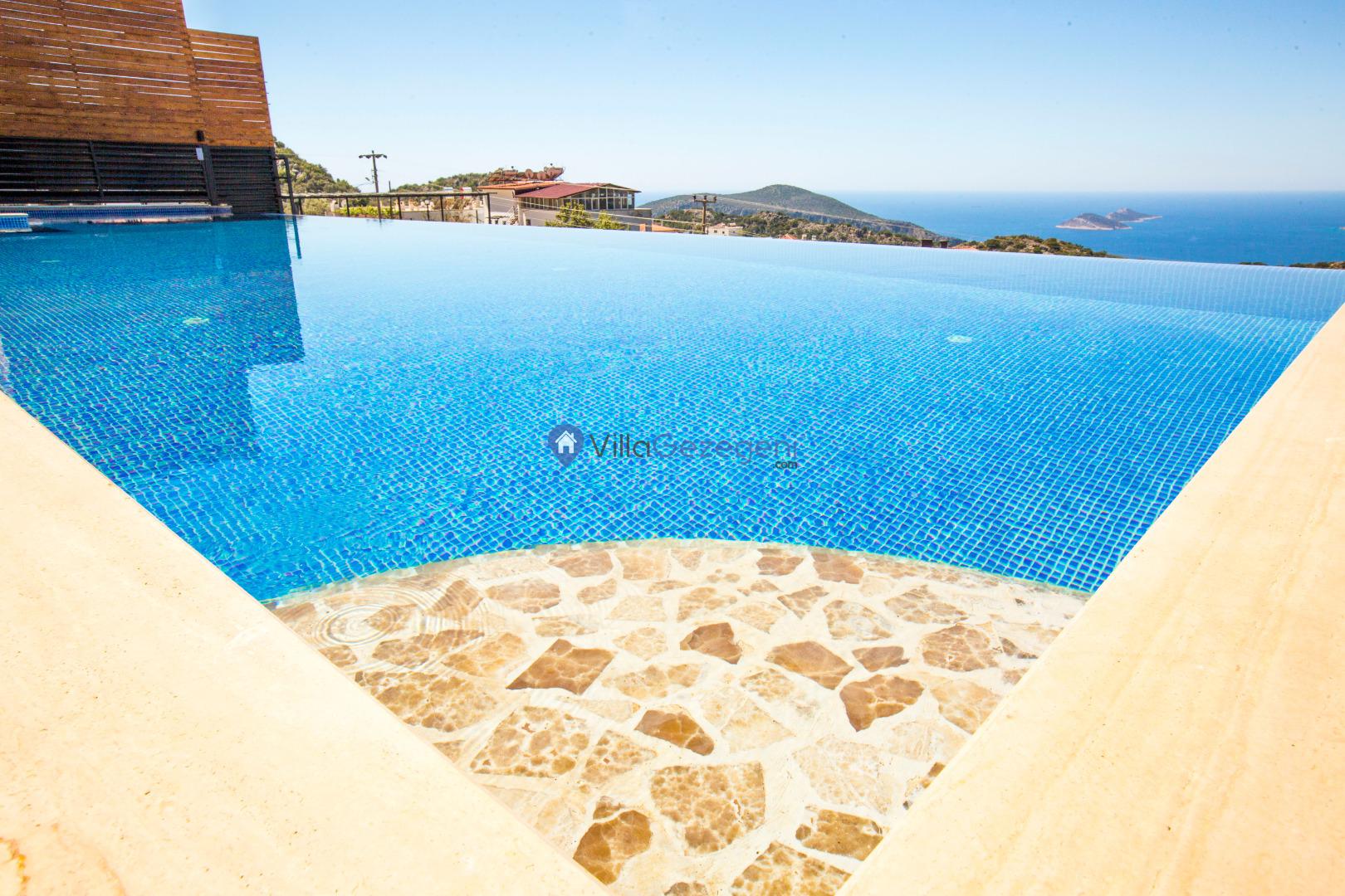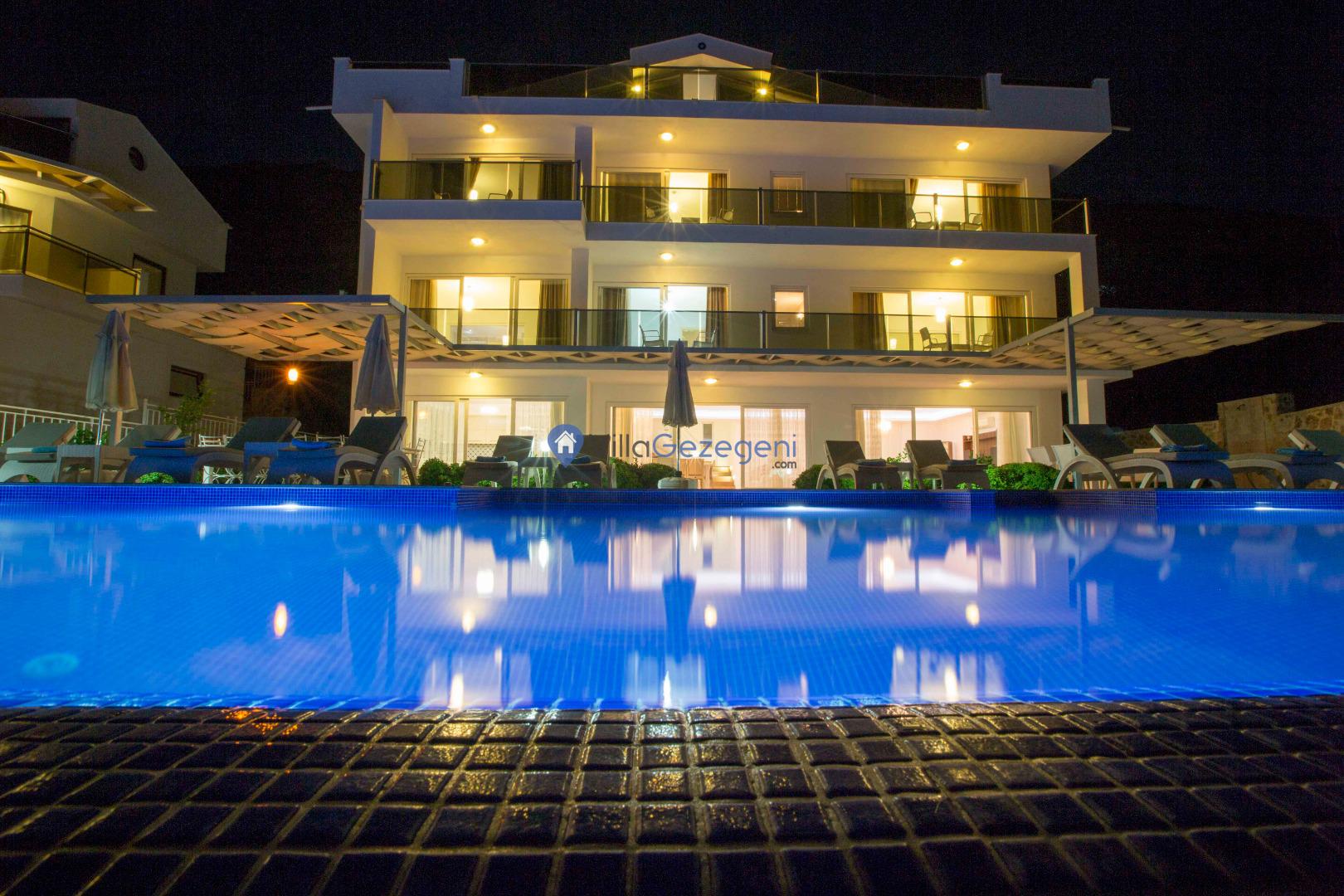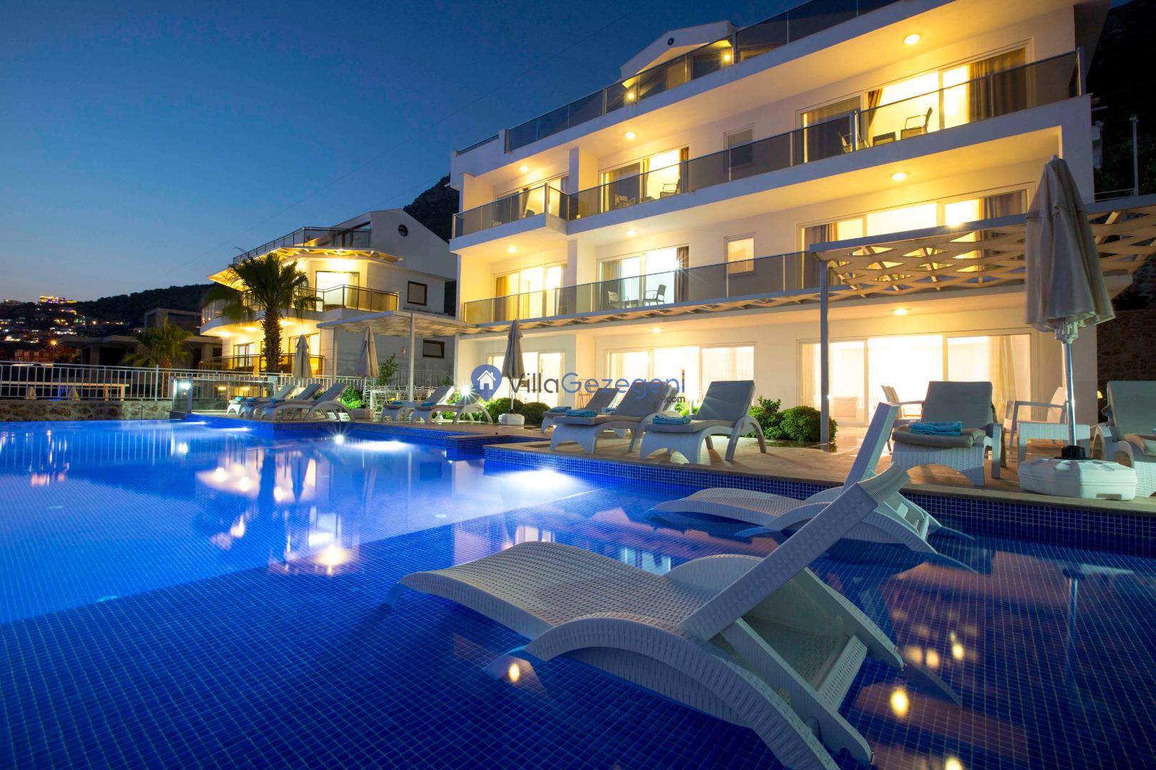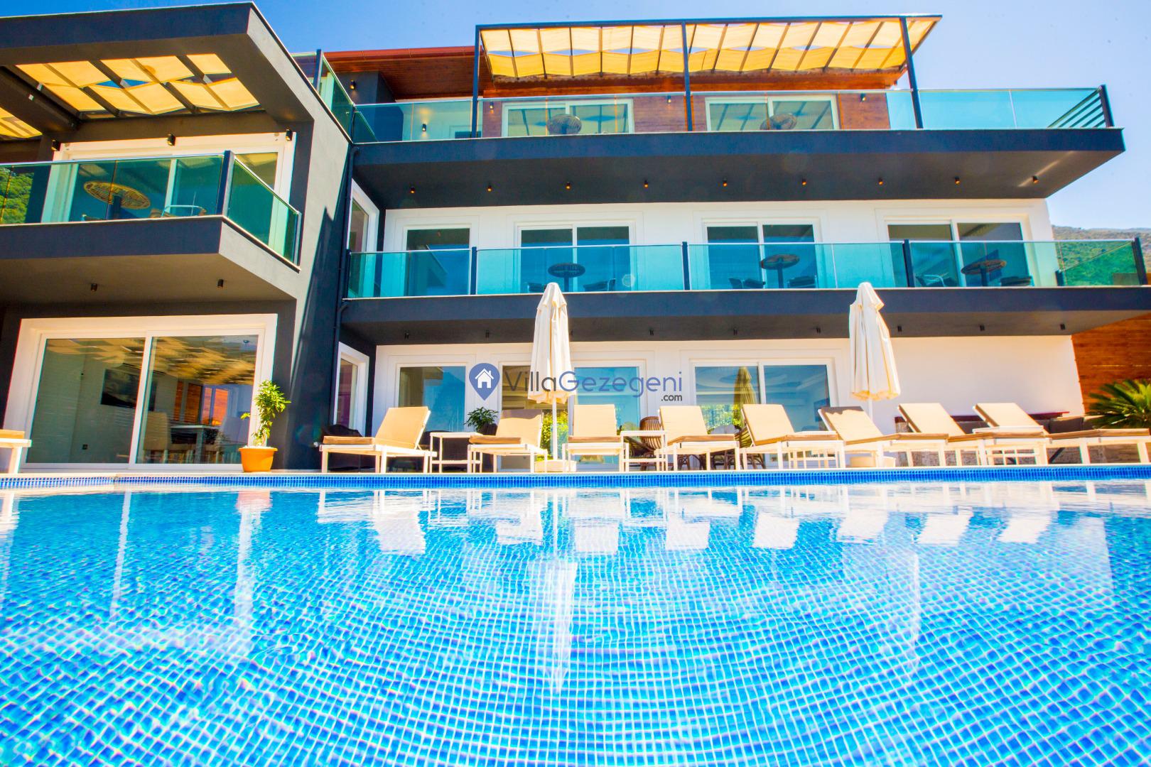 Villa Ela, Kalkan Akbel'de 12 kişilik, lüks, deniz manzaralı, jakuzili, ısıtmalı havuzlu, markete yakın, kiralık geniş aile ve arkadaş grubu villası.