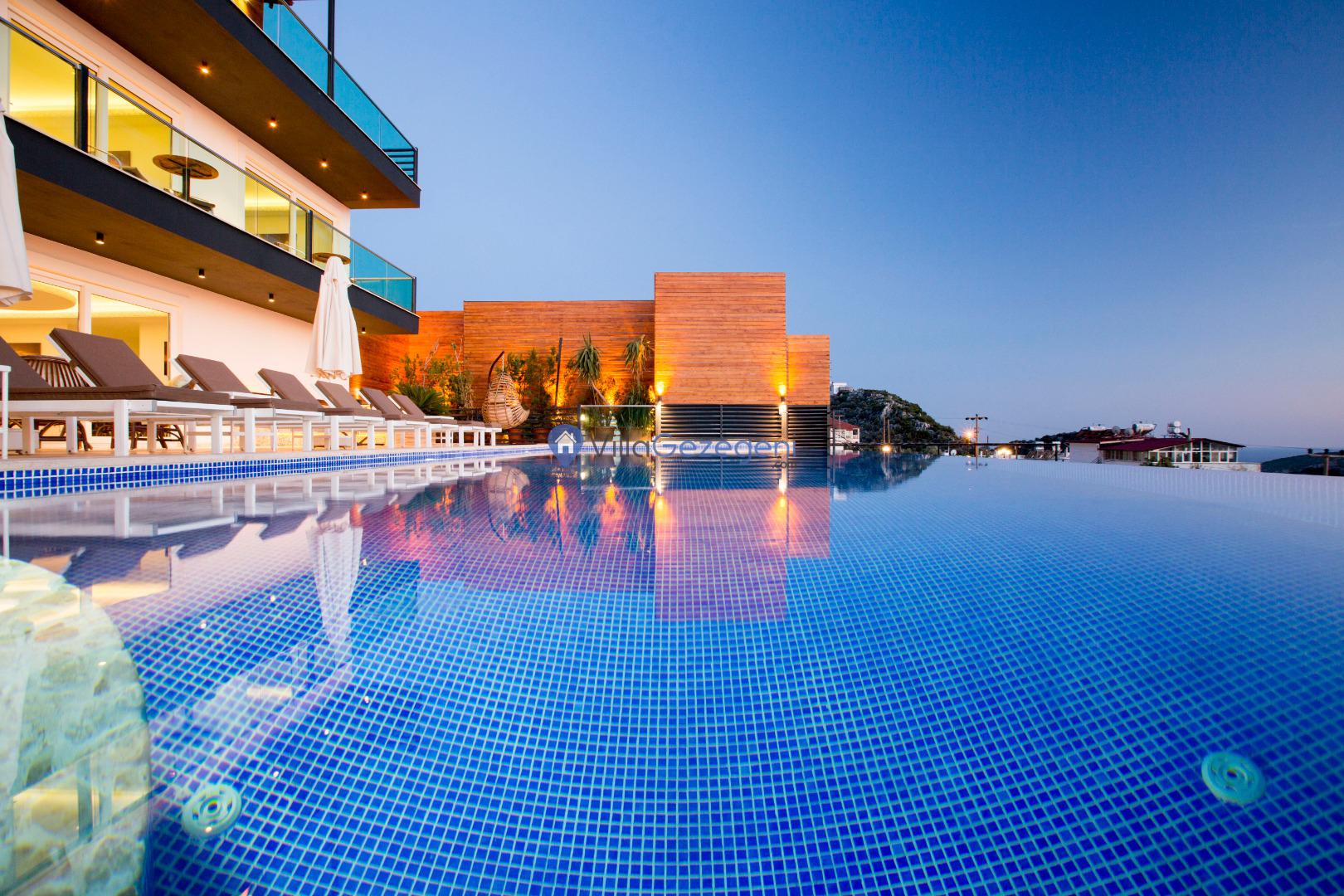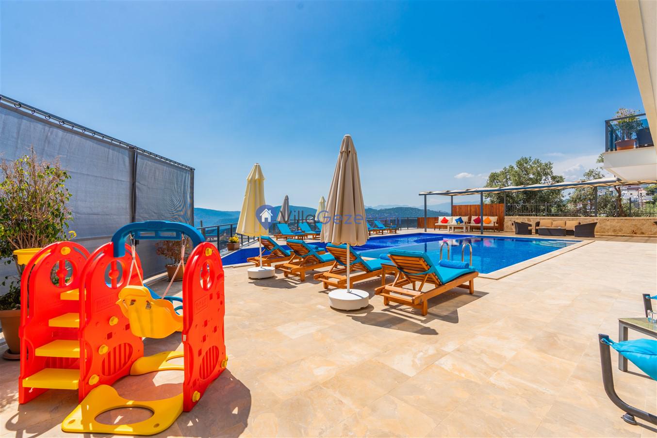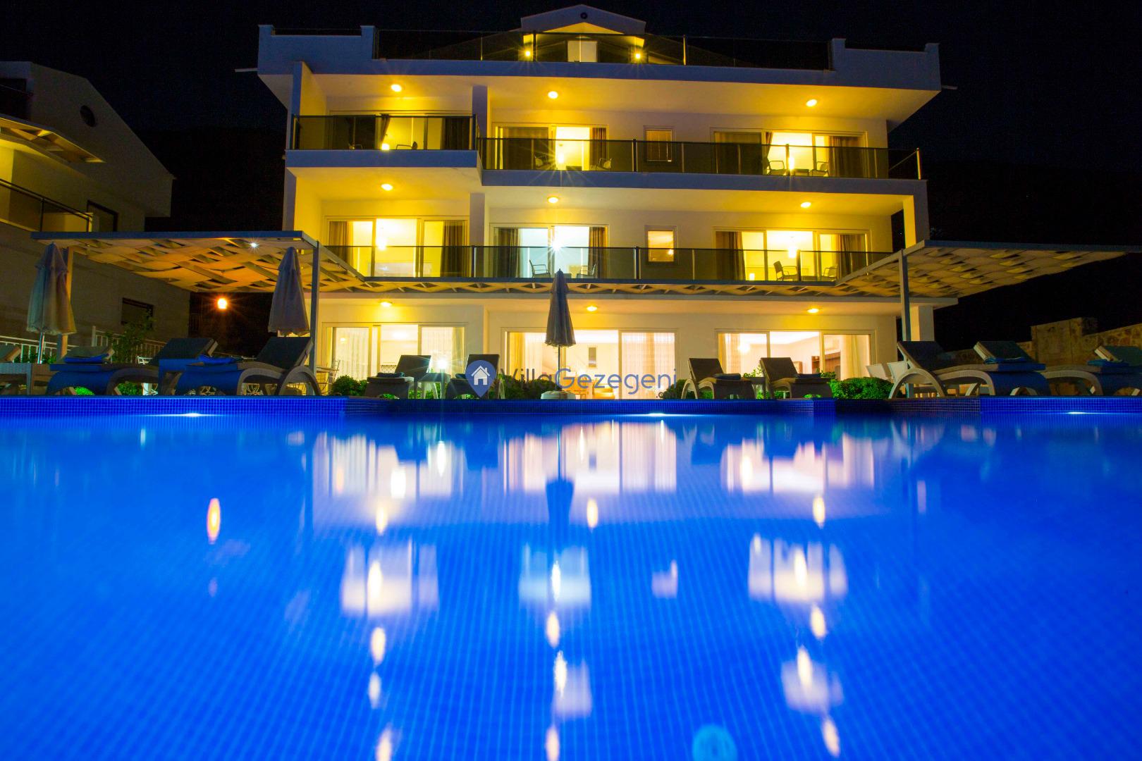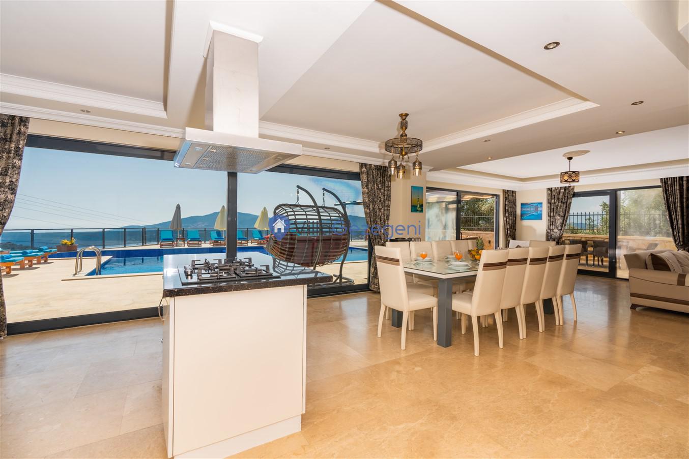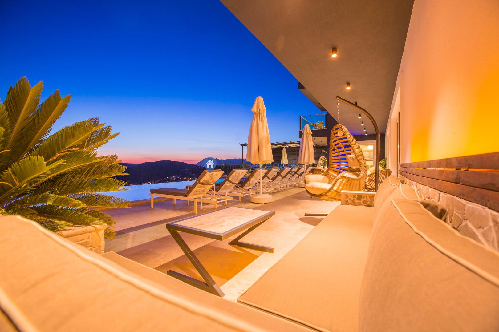Villa Ela, Kalkan Akbel'de 12 kişilik, lüks, deniz manzaralı, jakuzili, ısıtmalı havuzlu, markete yakın, kiralık geniş aile ve arkadaş grubu villası.
