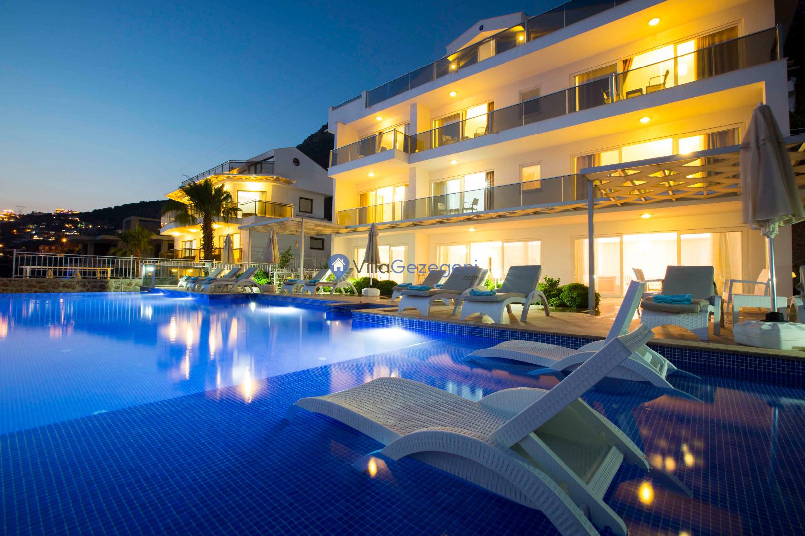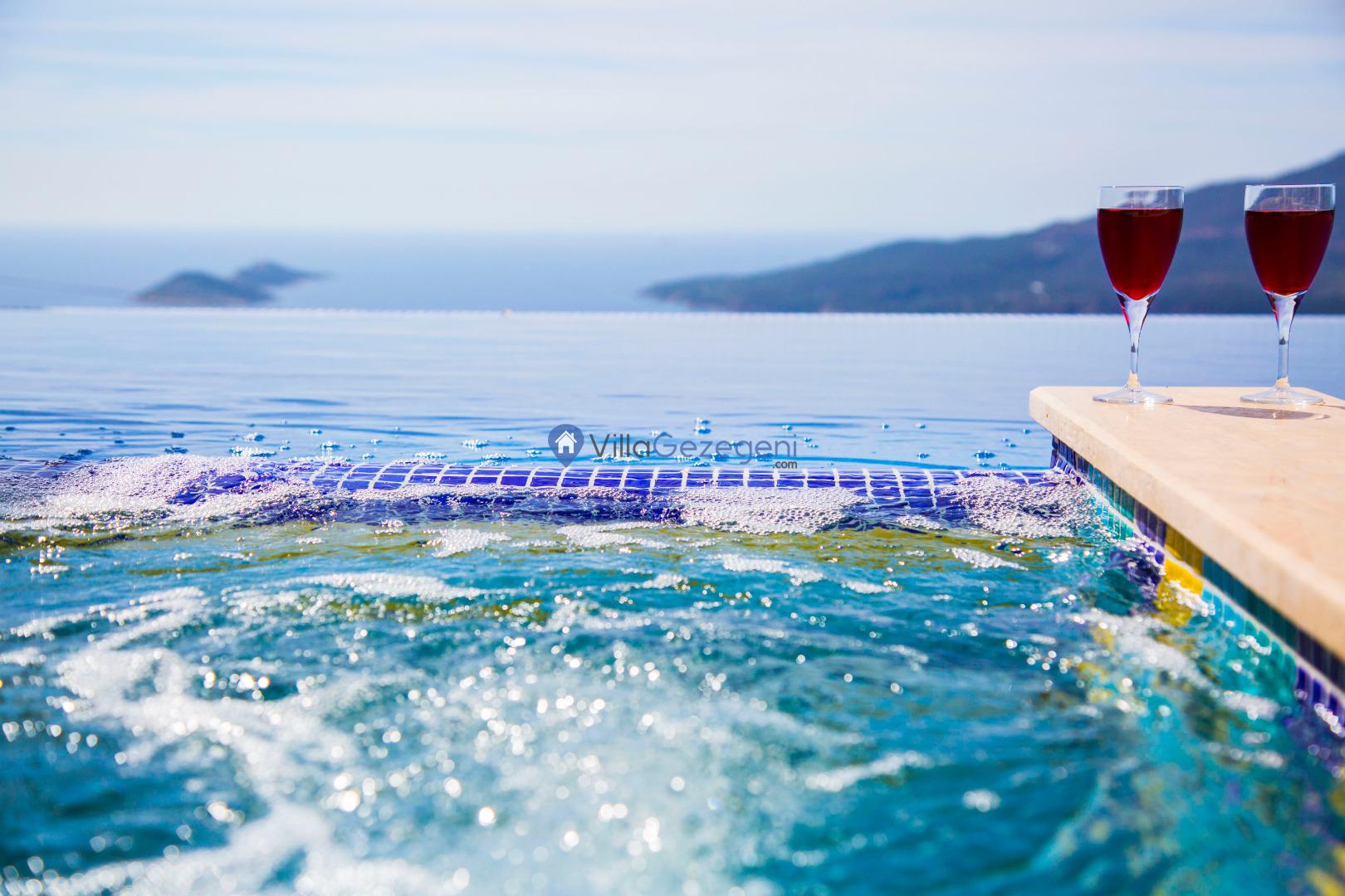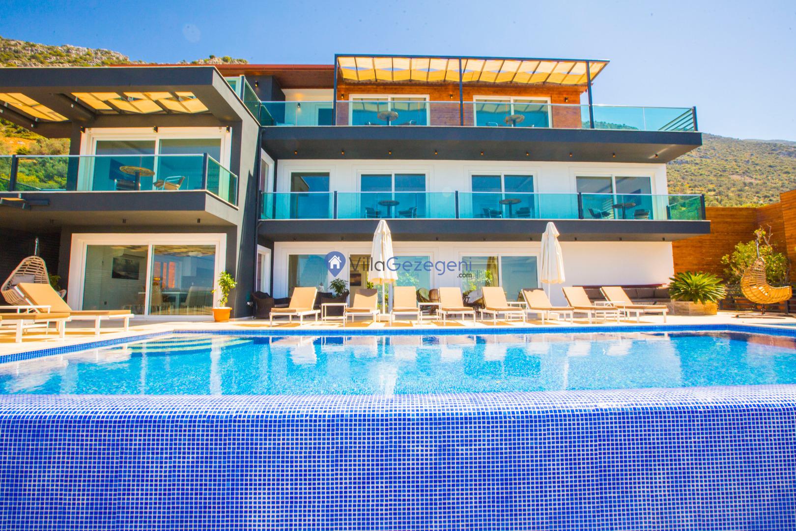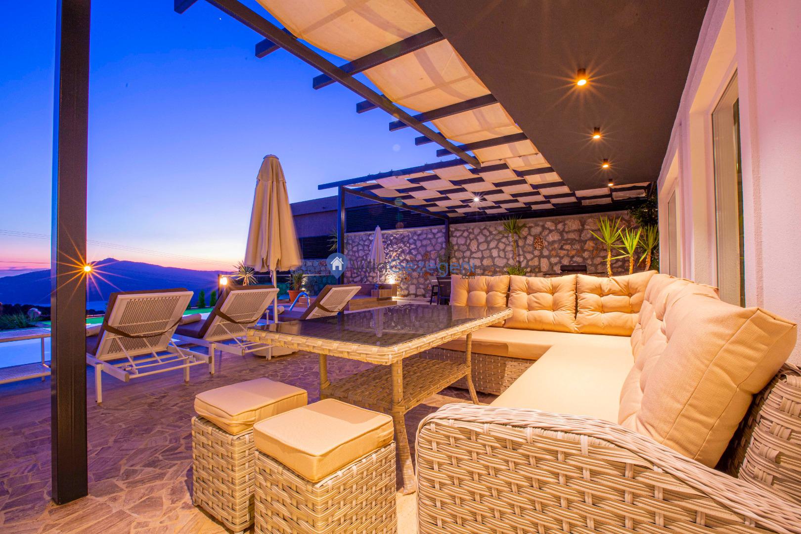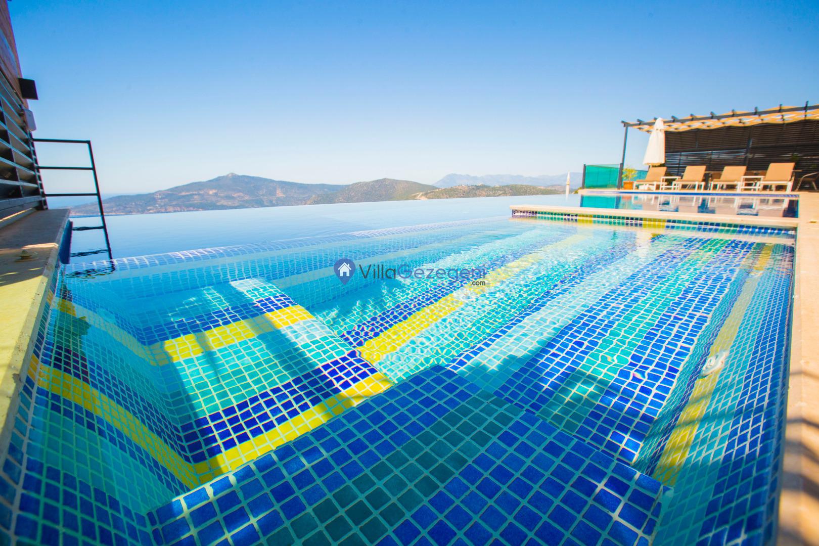 Villa Ela, Kalkan Akbel'de 12 kişilik, lüks, deniz manzaralı, jakuzili, ısıtmalı havuzlu, markete yakın, kiralık geniş aile ve arkadaş grubu villası.