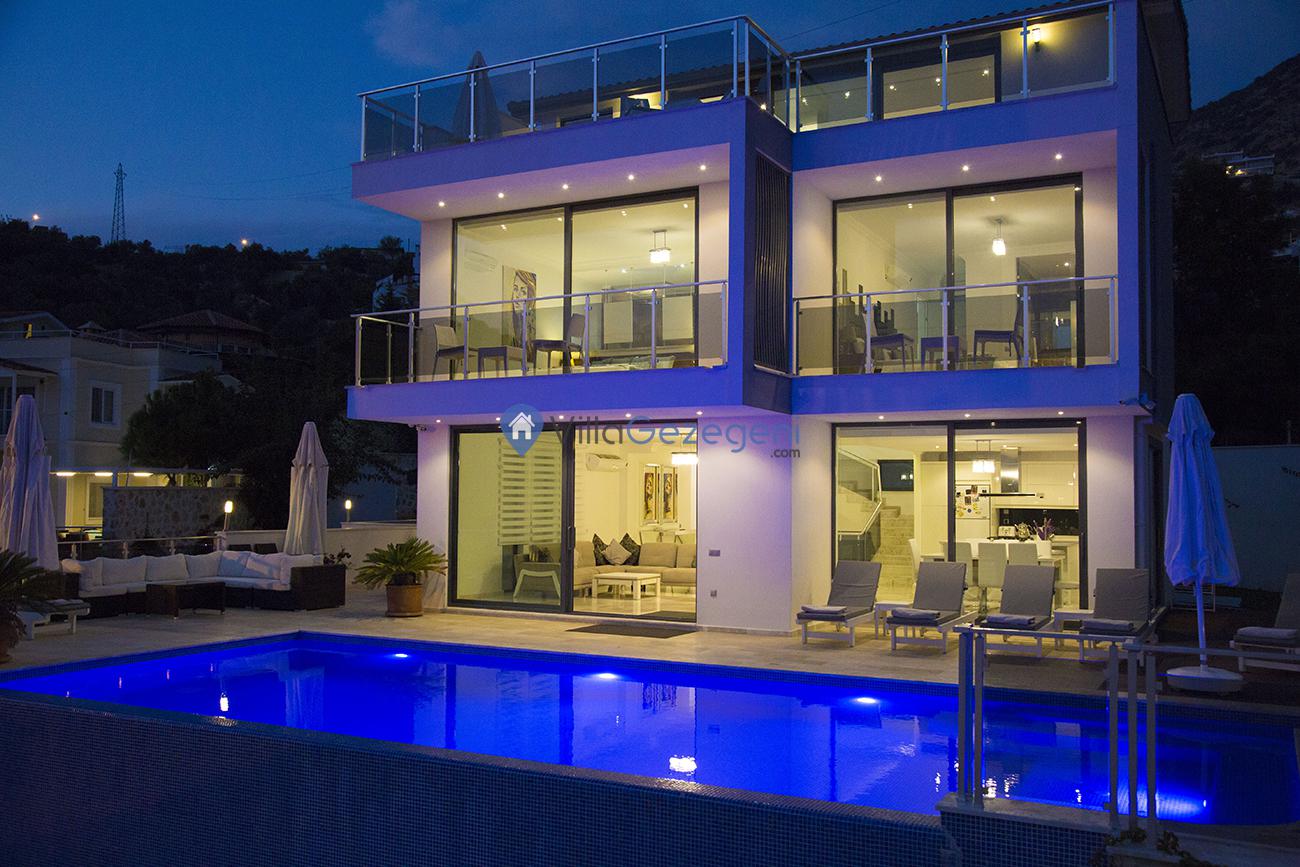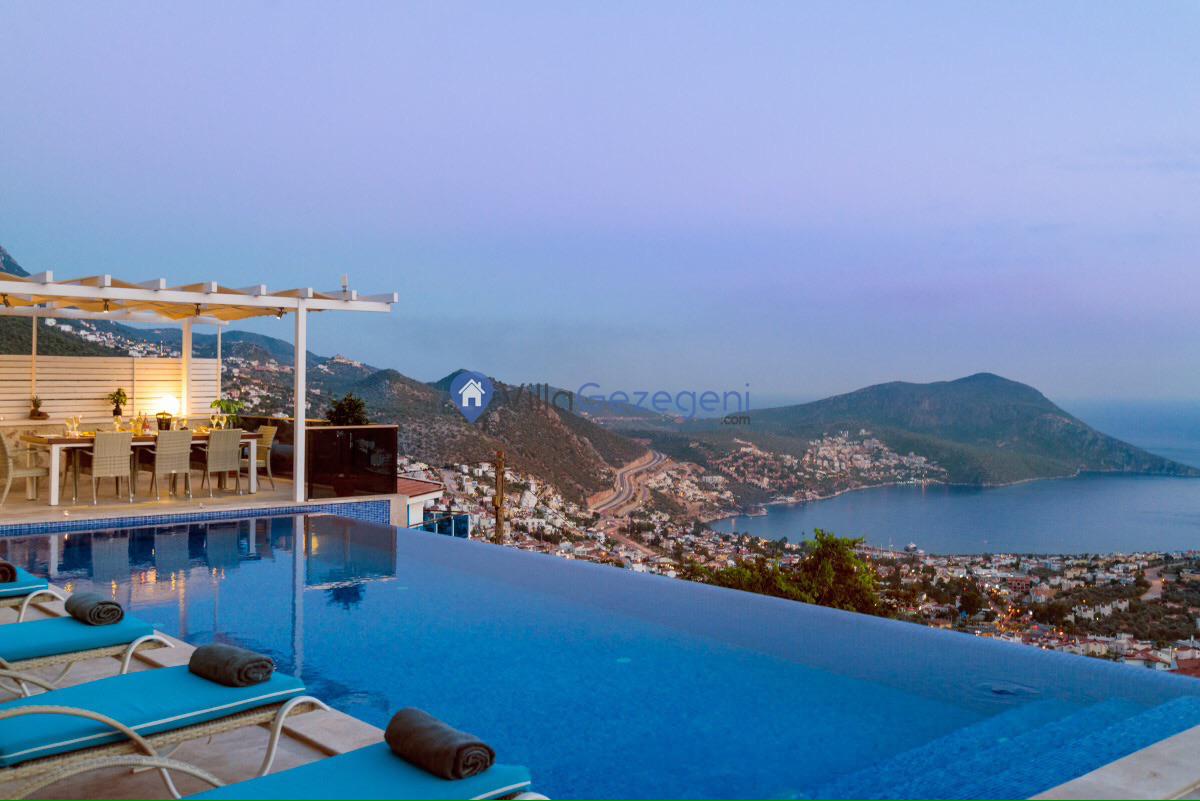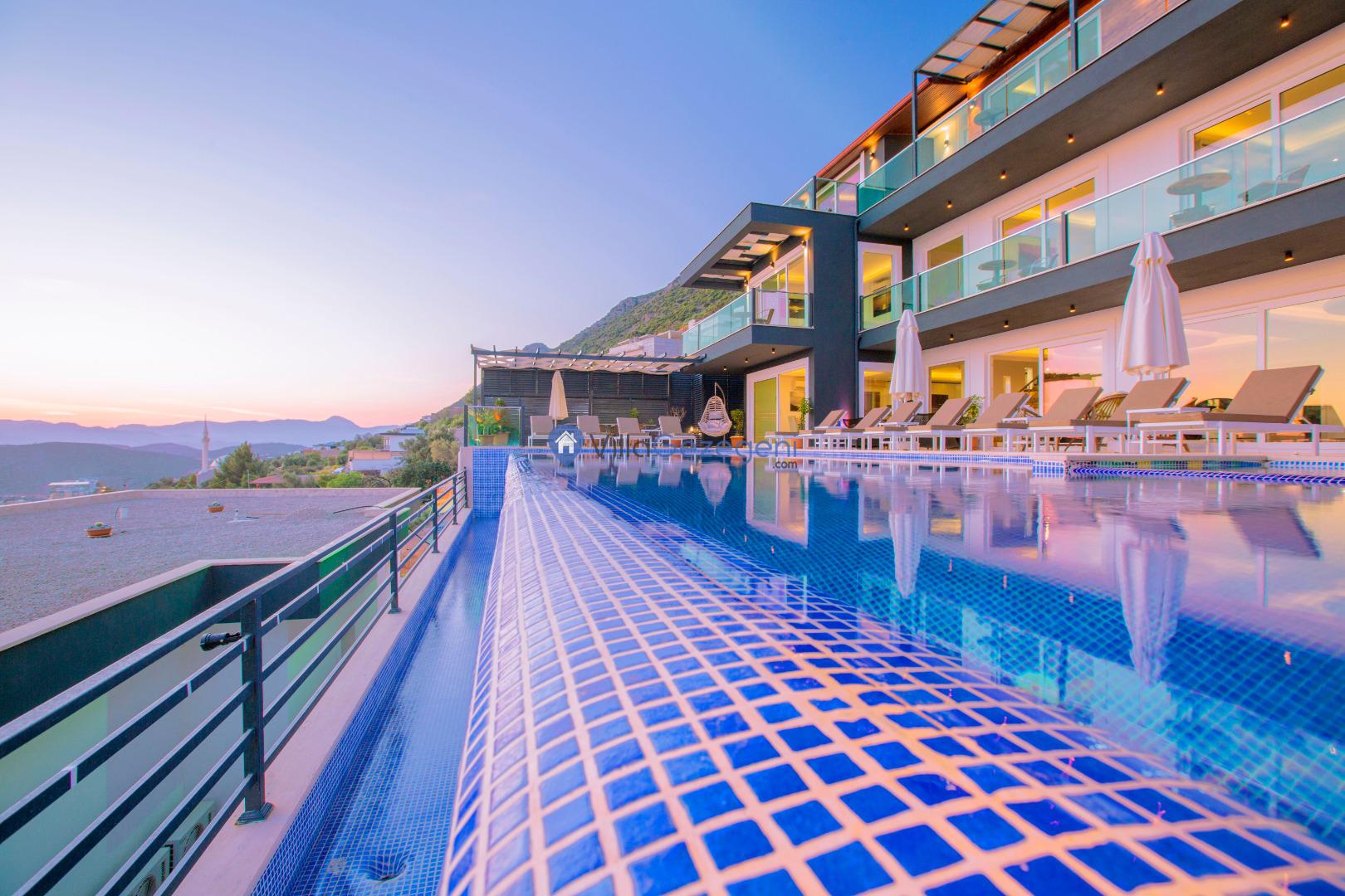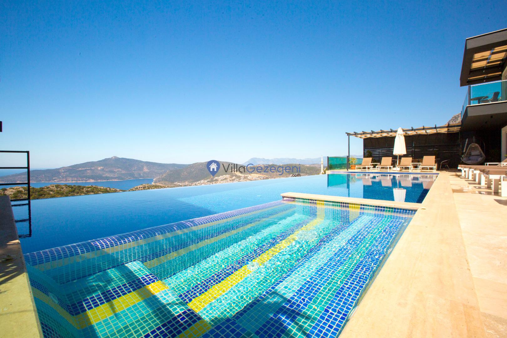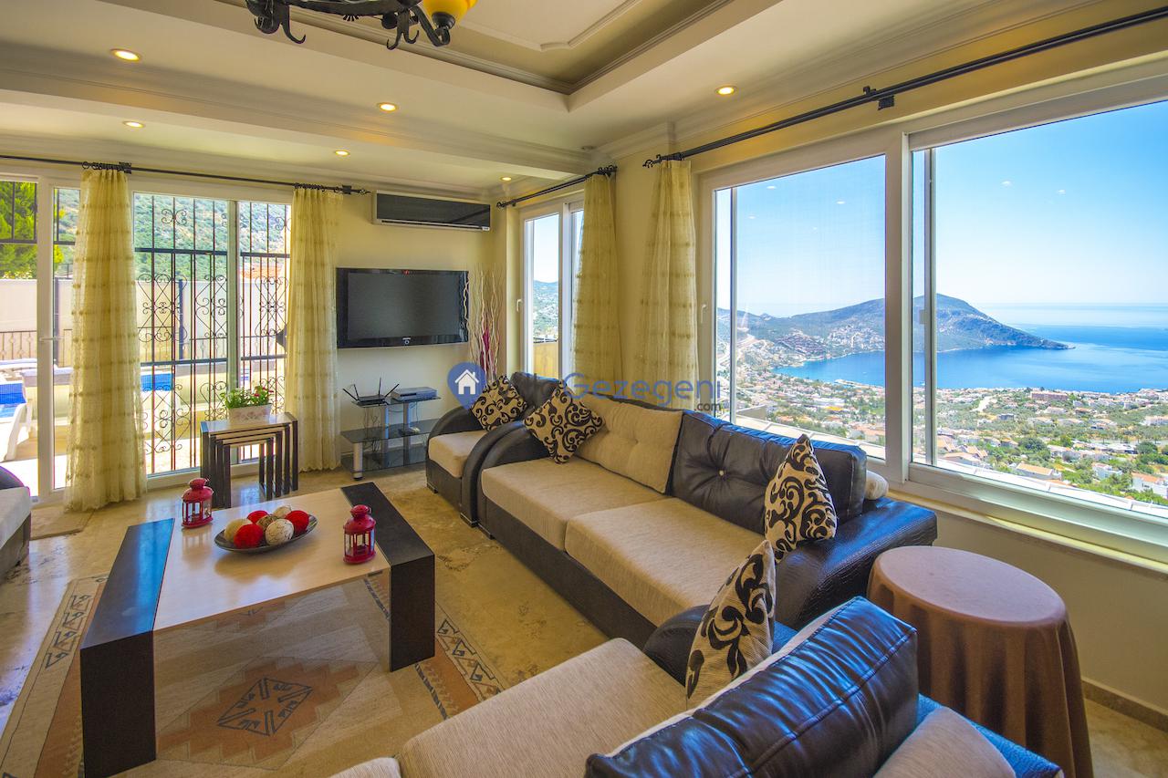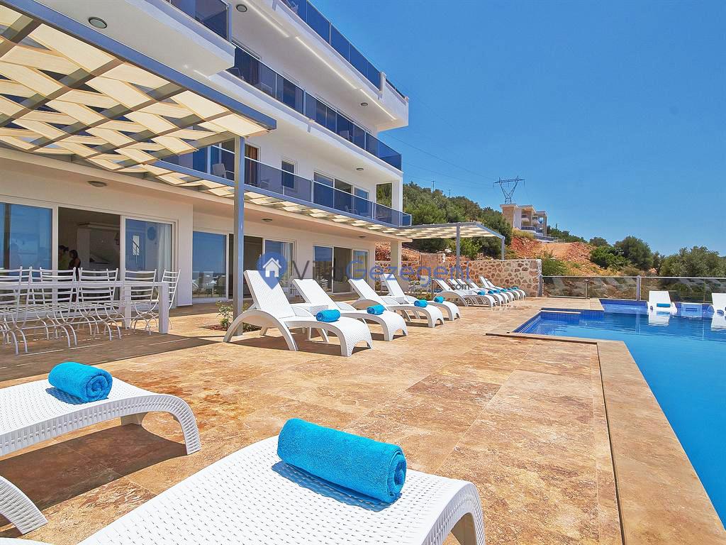 Villa Ela, Kalkan Akbel'de 12 kişilik, lüks, deniz manzaralı, jakuzili, ısıtmalı havuzlu, markete yakın, kiralık geniş aile ve arkadaş grubu villası.