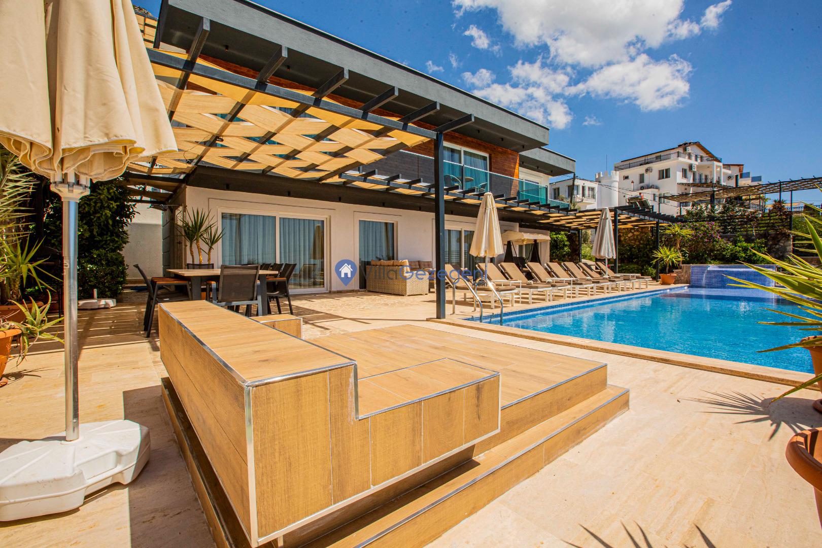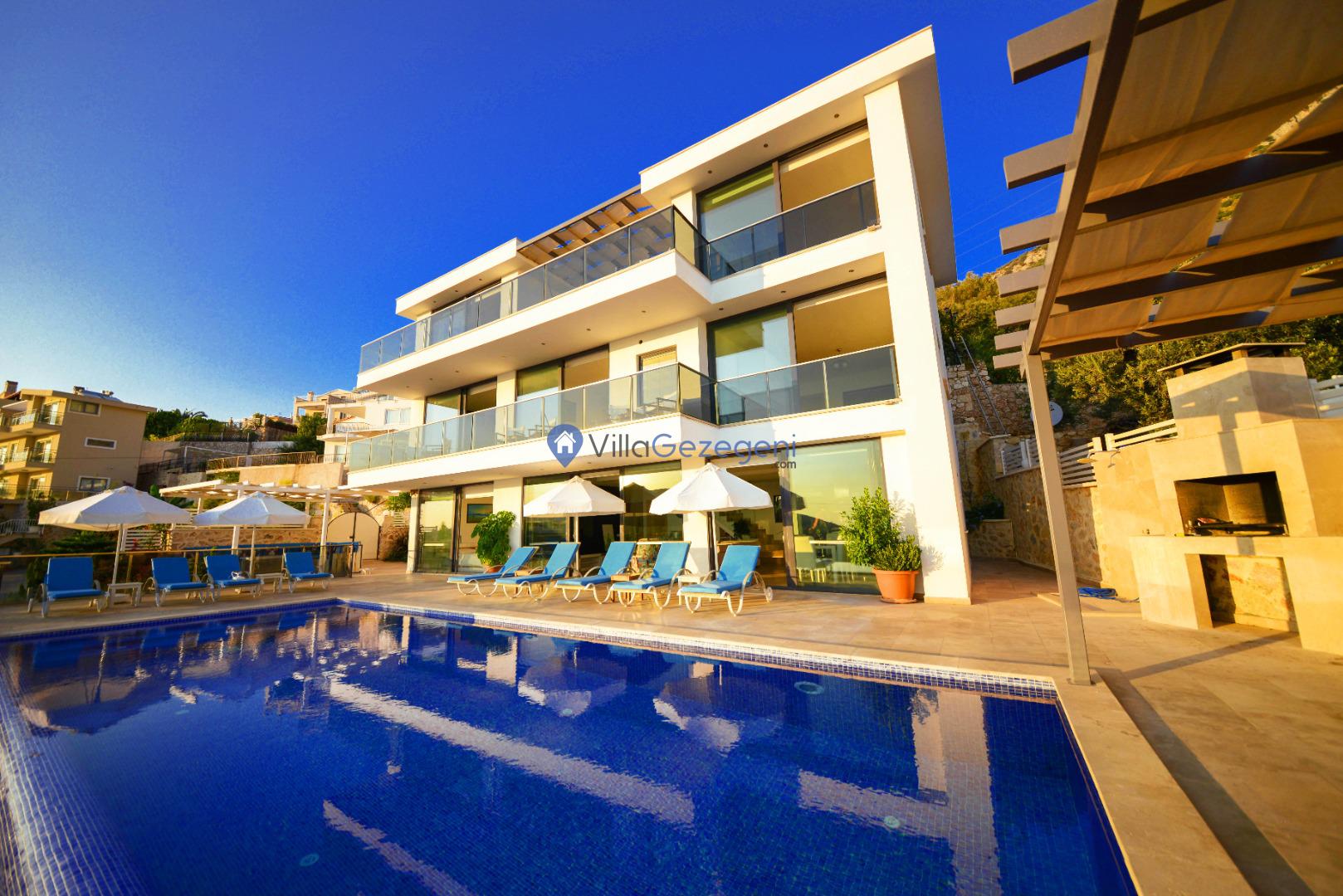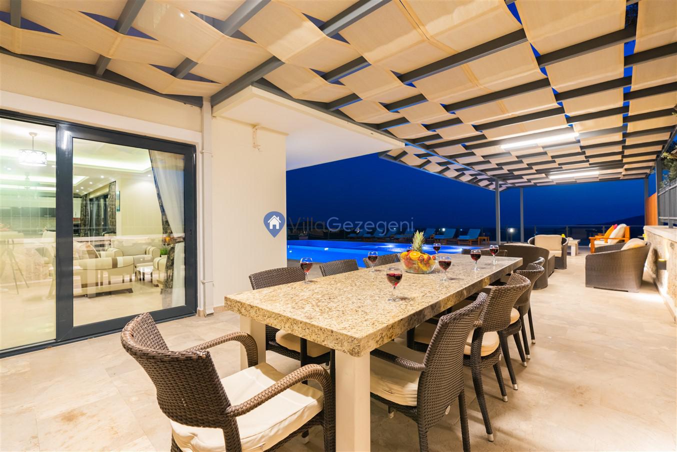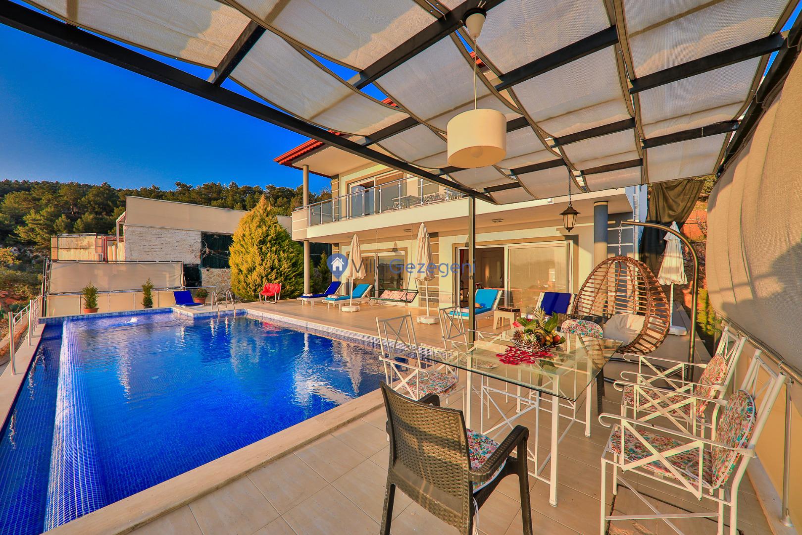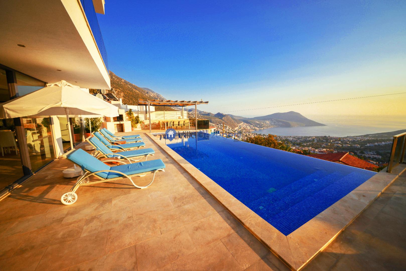 Villa Ela, Kalkan Akbel'de 12 kişilik, lüks, deniz manzaralı, jakuzili, ısıtmalı havuzlu, markete yakın, kiralık geniş aile ve arkadaş grubu villası.