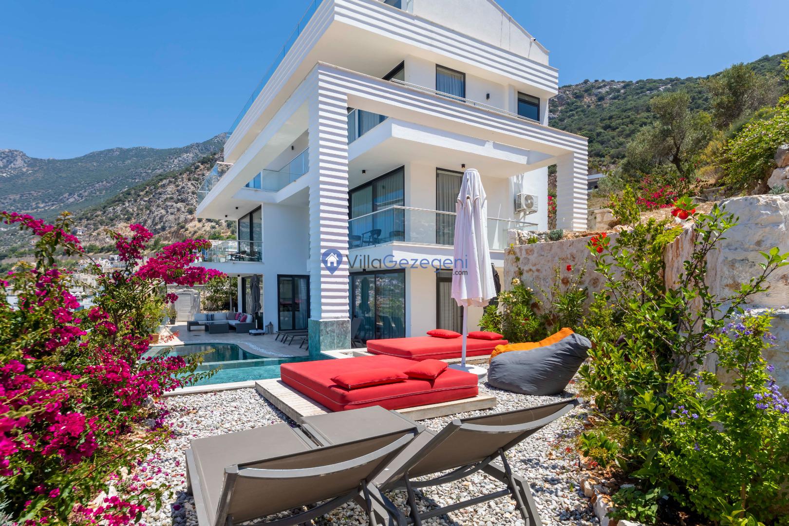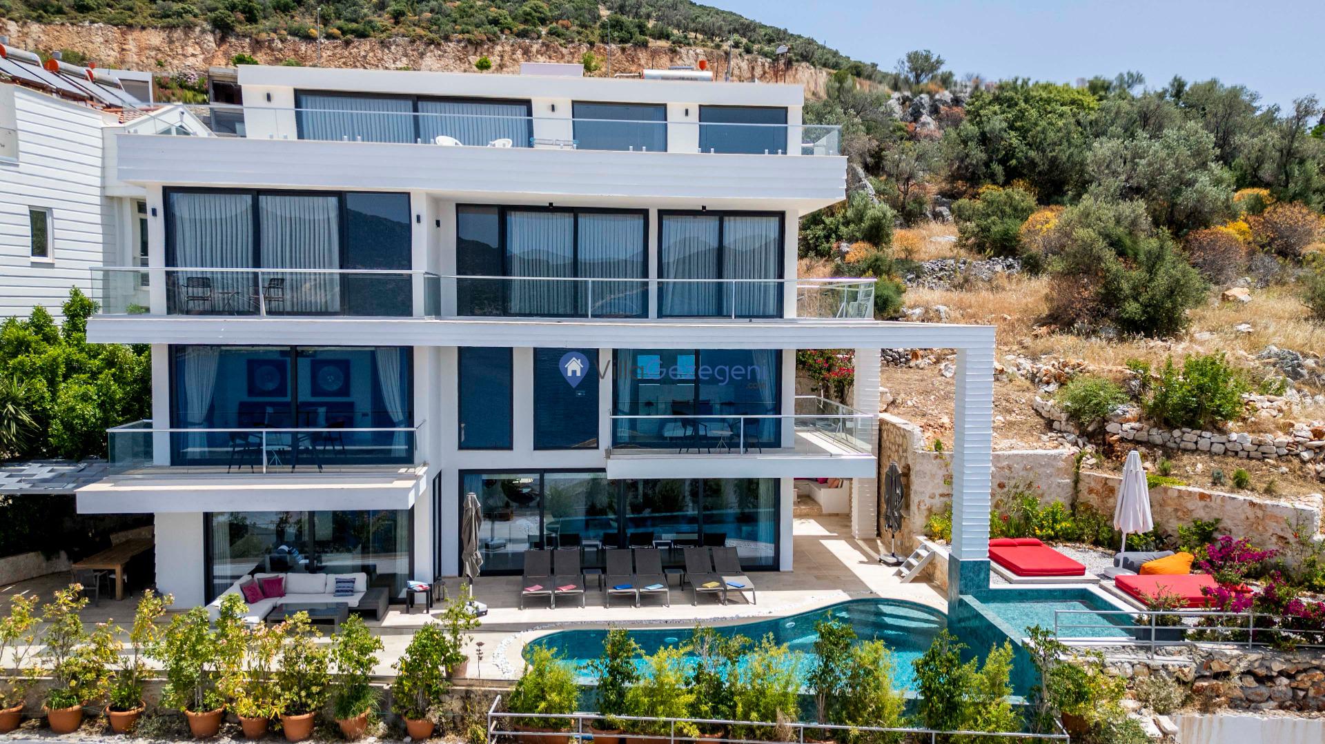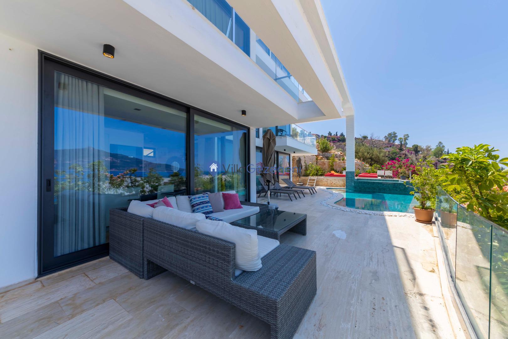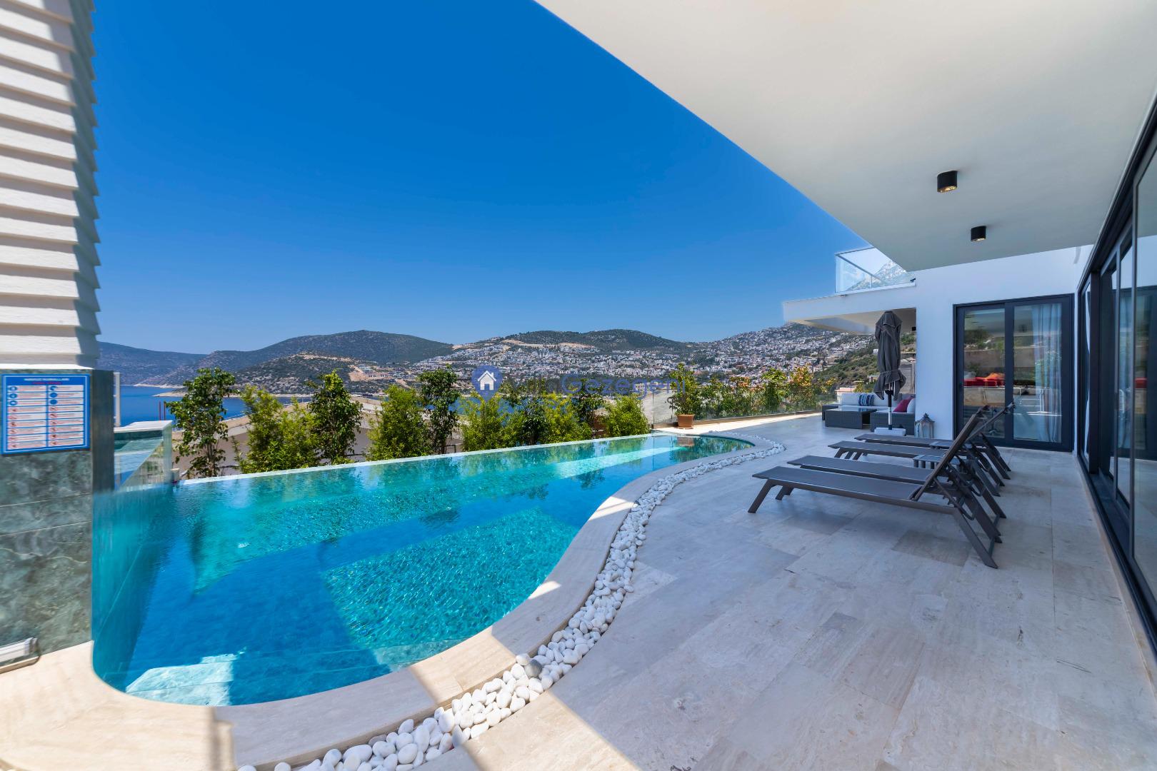 Villa Panoramas, Kalkan Kalamar'da 8 kişilik, lüks tasarımlı, muhteşem deniz manzaralı, merkeze yakın konumda, kalabalık gruplar için uygun kiralık villa.