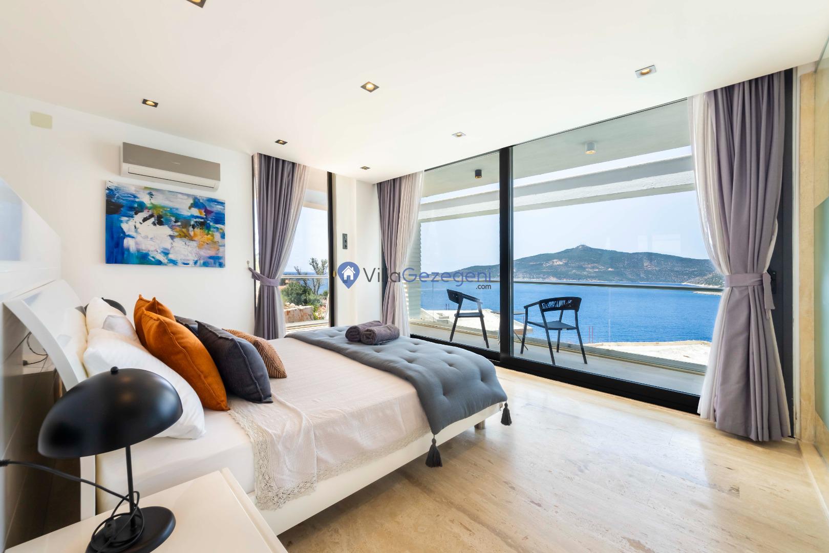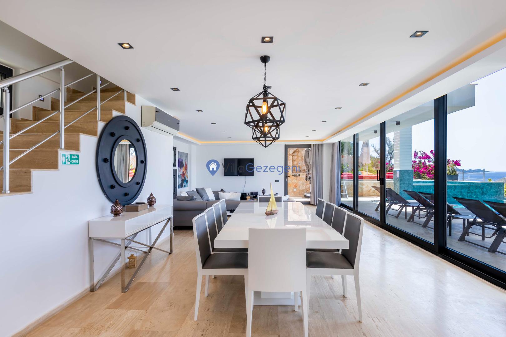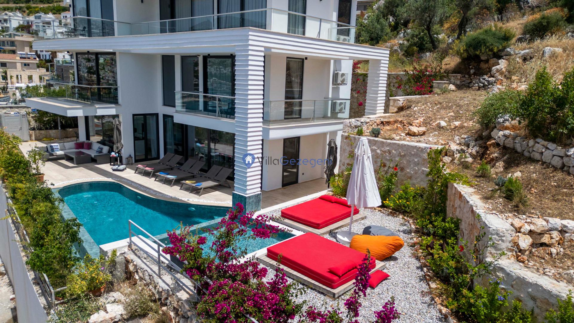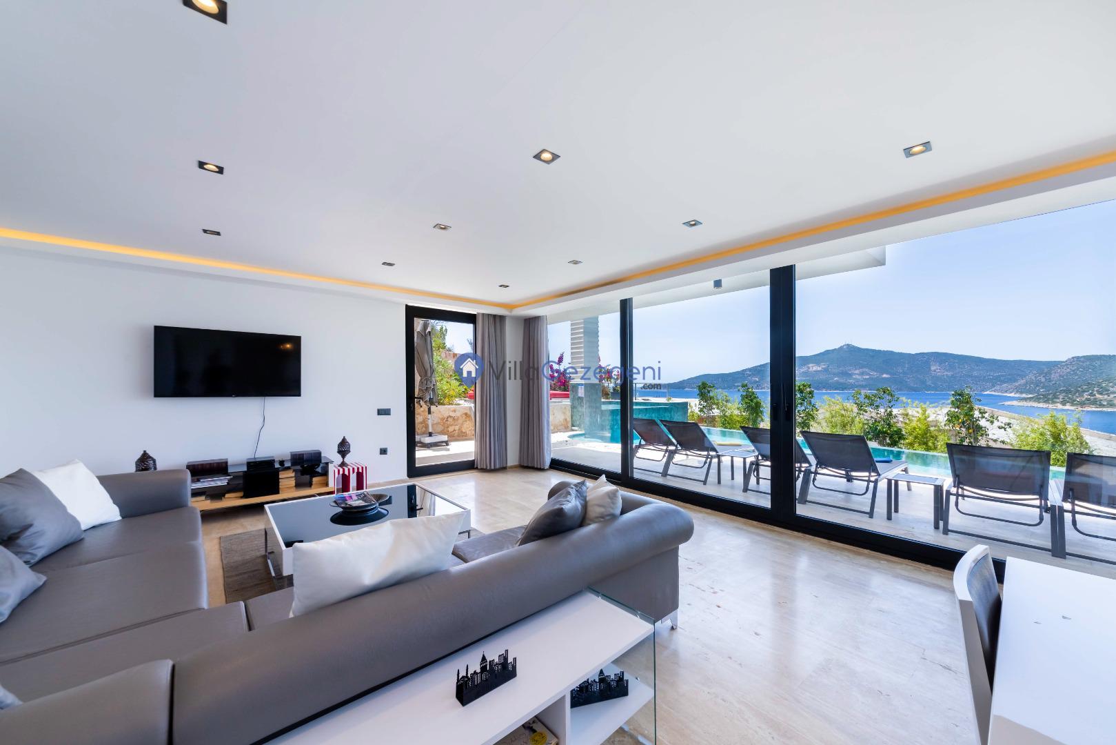 Villa Panoramas, Kalkan Kalamar'da 8 kişilik, lüks tasarımlı, muhteşem deniz manzaralı, merkeze yakın konumda, kalabalık gruplar için uygun kiralık villa.