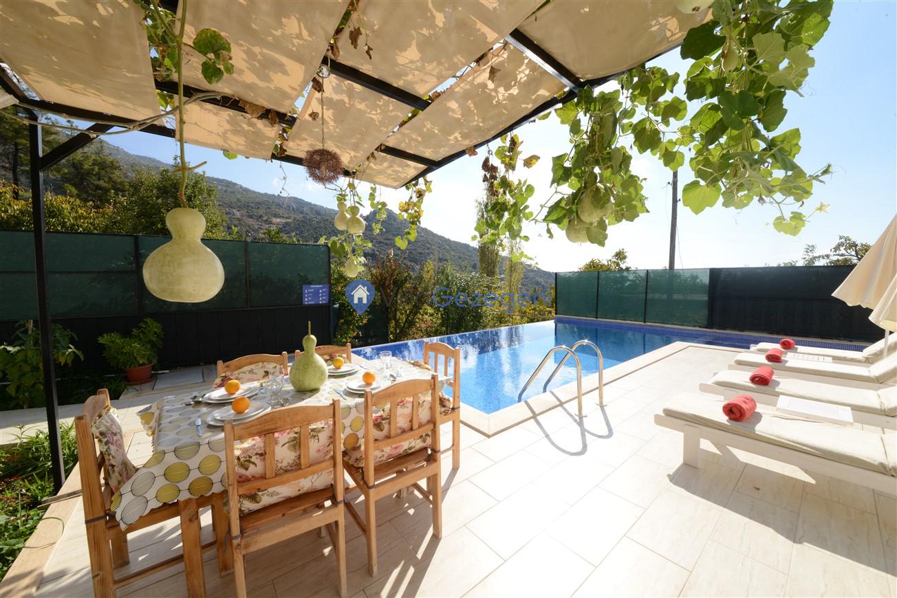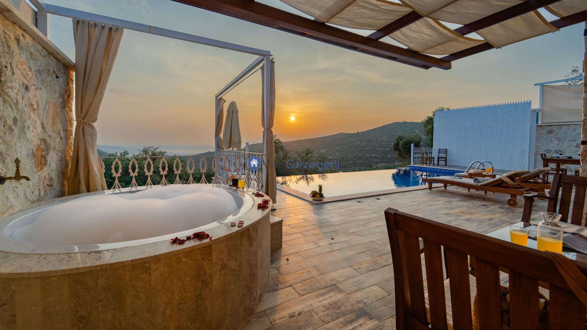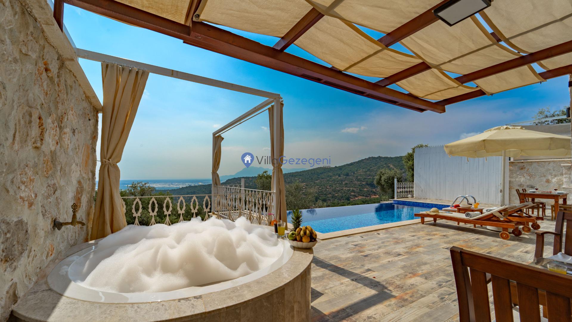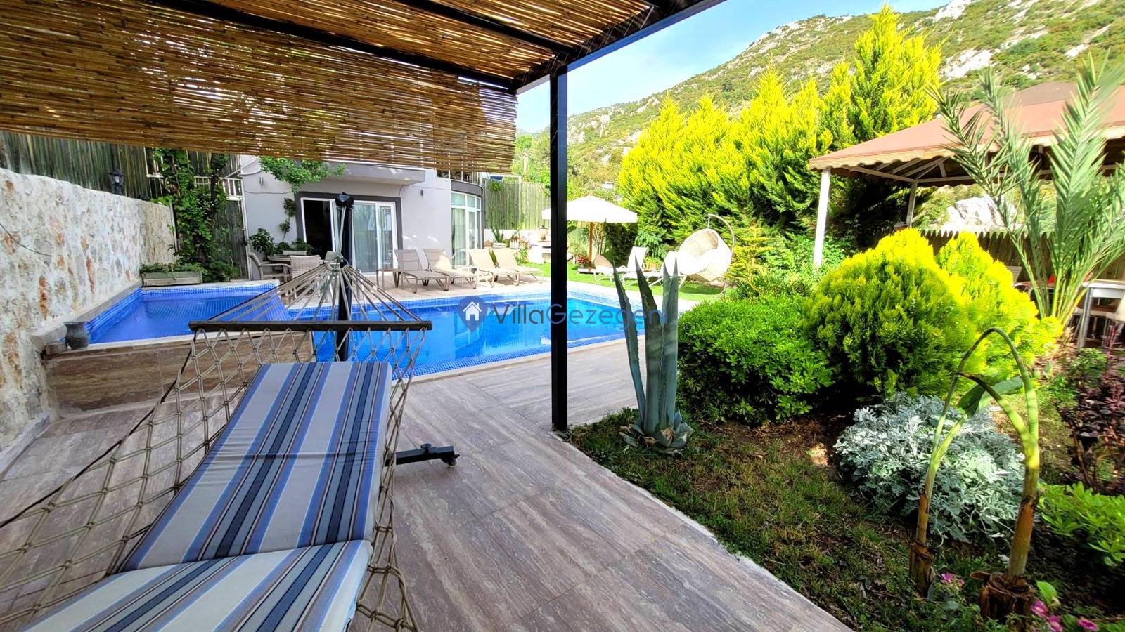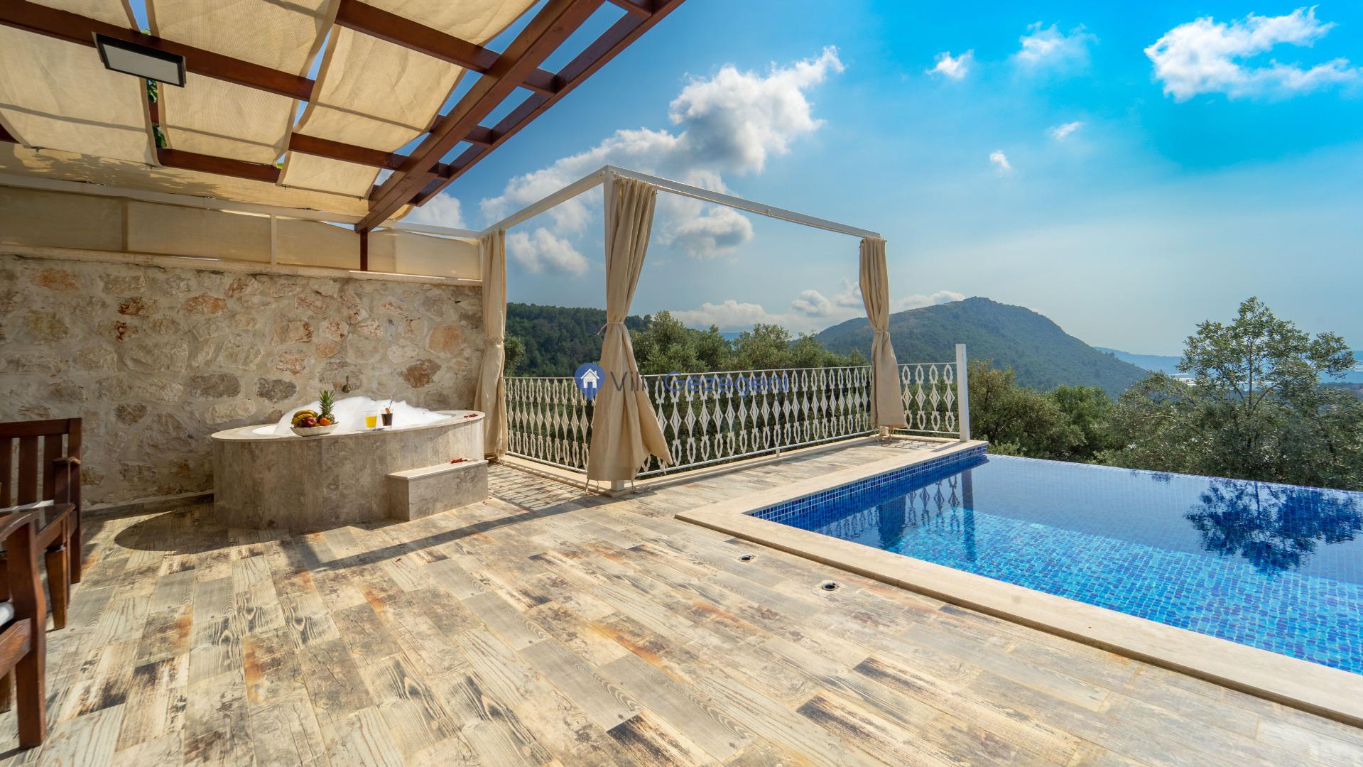 Villa Asaf, Kalkan Üzümlü'de 4 kişilik, markete merkeze ve restaurantlara yakın, jakuzili, doğa içerisinde bulunan kiralık muhafazakar balayı villası.