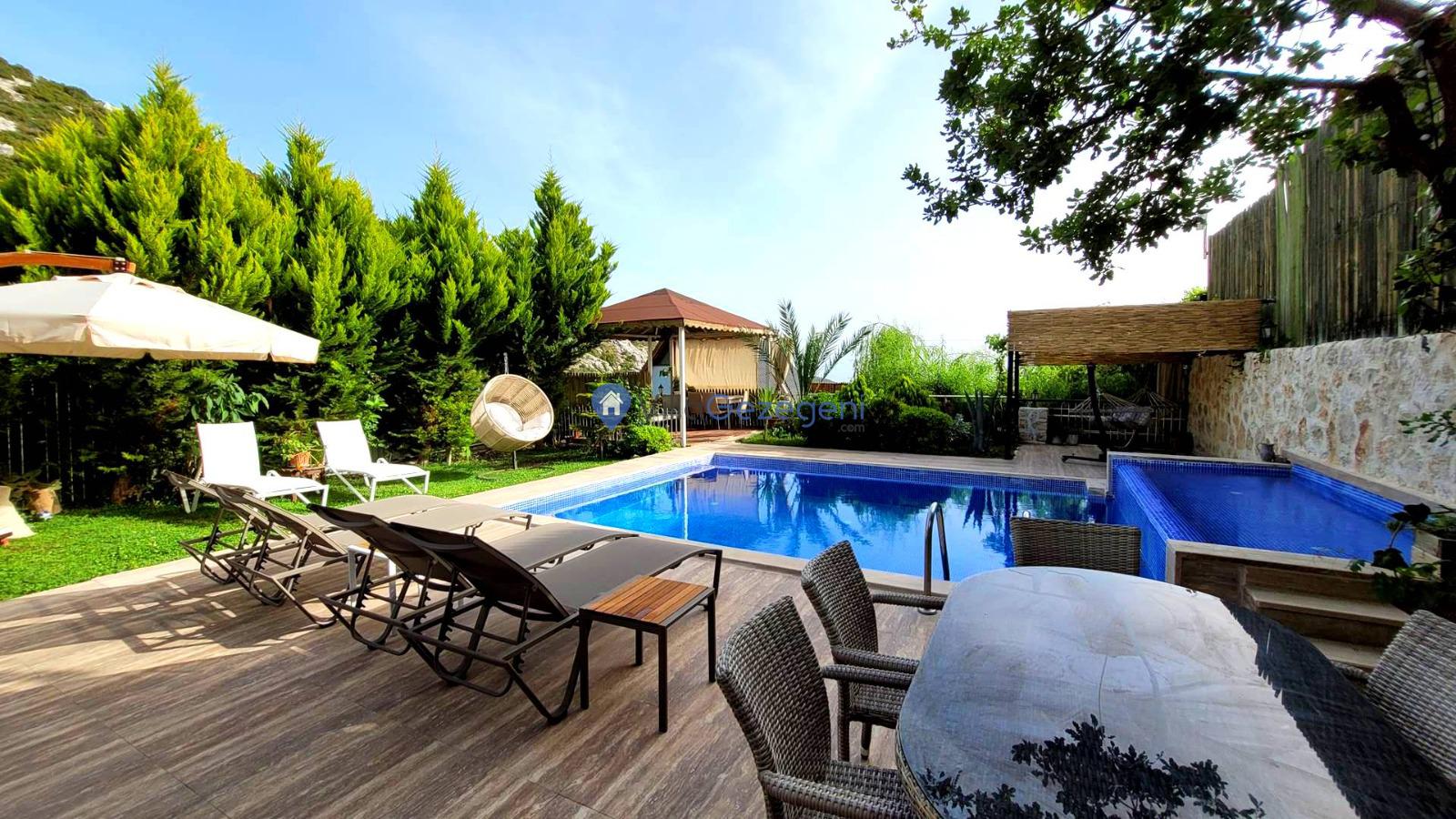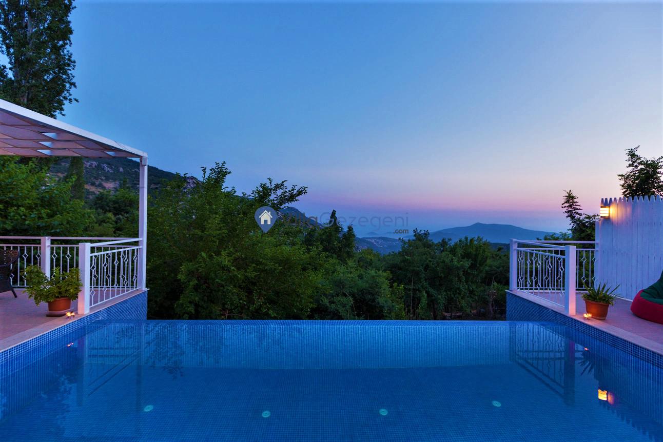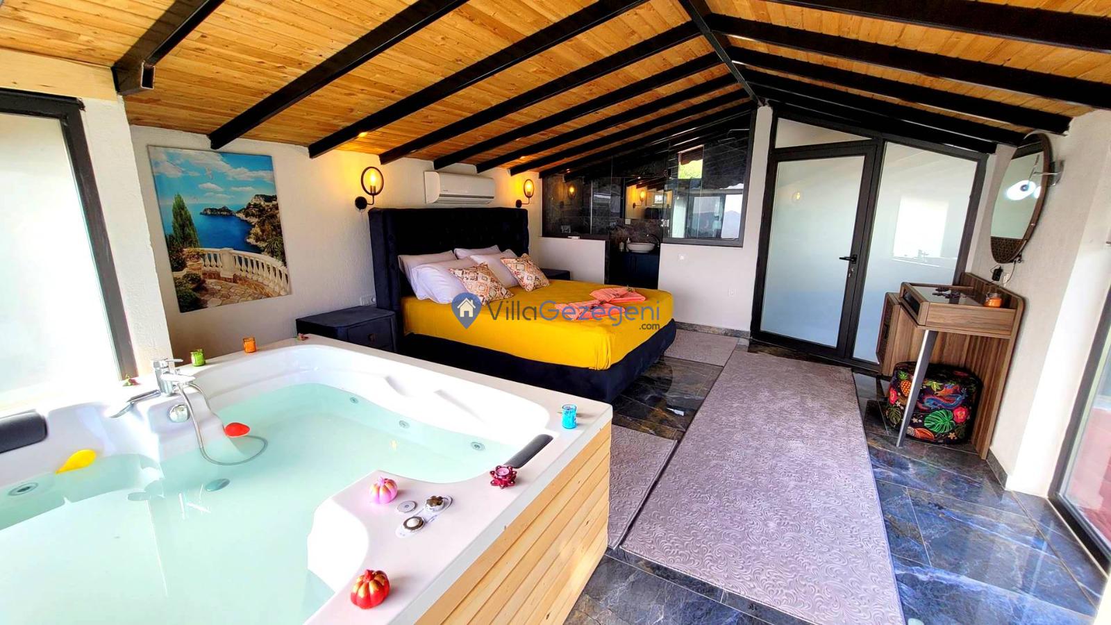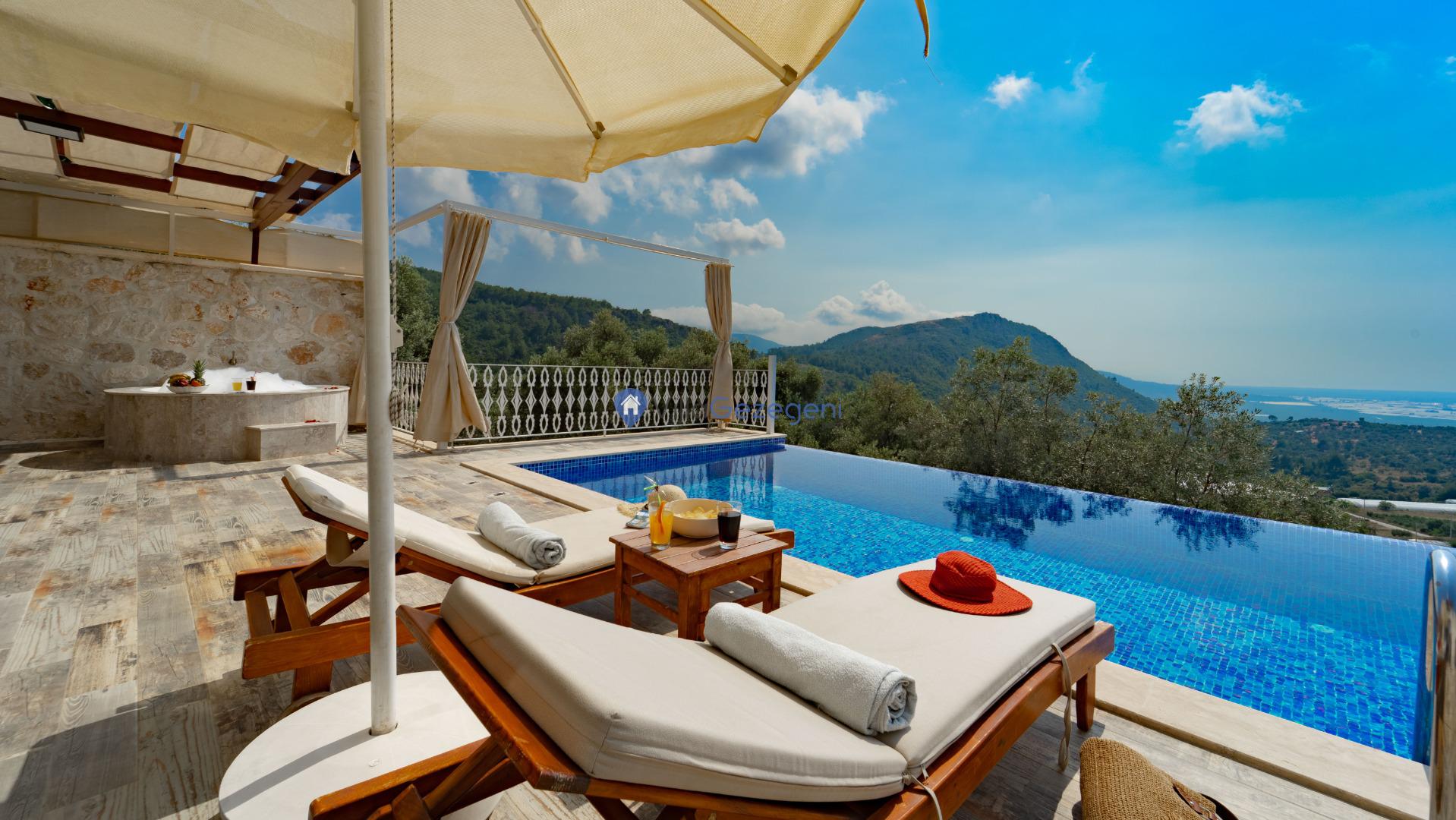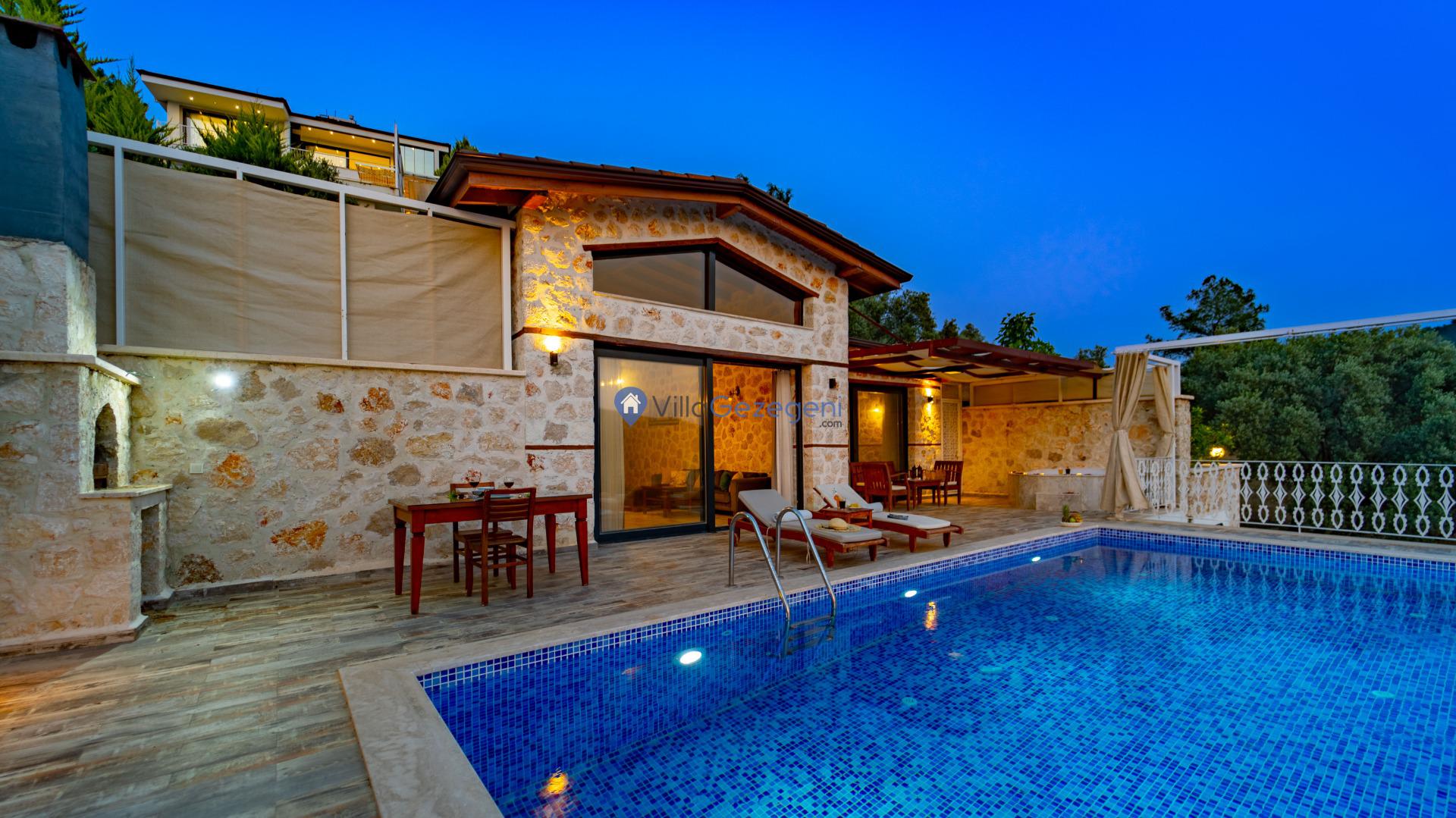 Villa Asaf, Kalkan Üzümlü'de 4 kişilik, markete merkeze ve restaurantlara yakın, jakuzili, doğa içerisinde bulunan kiralık muhafazakar balayı villası.