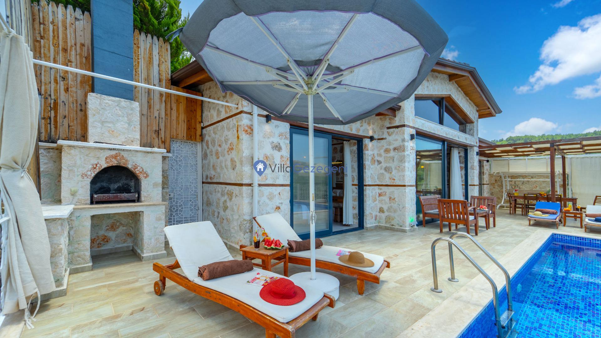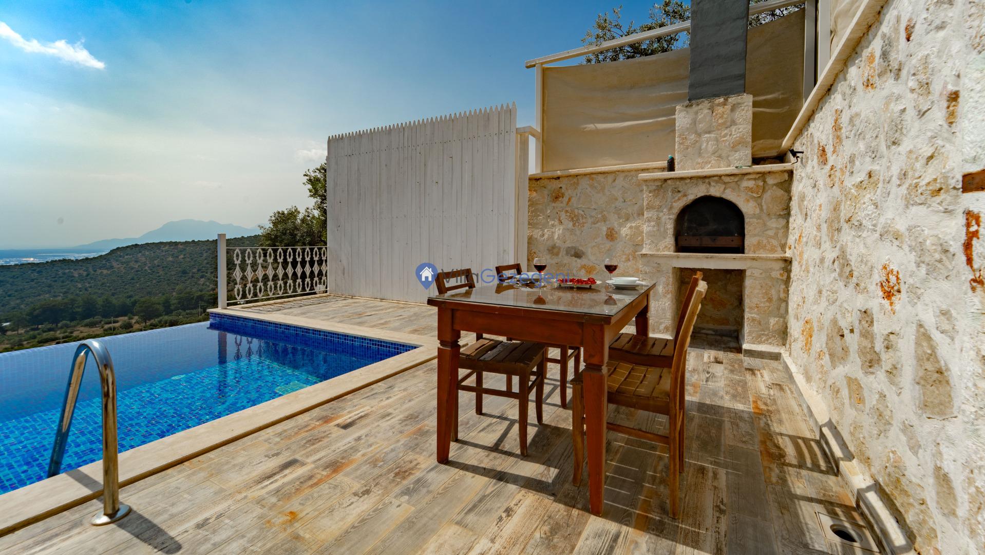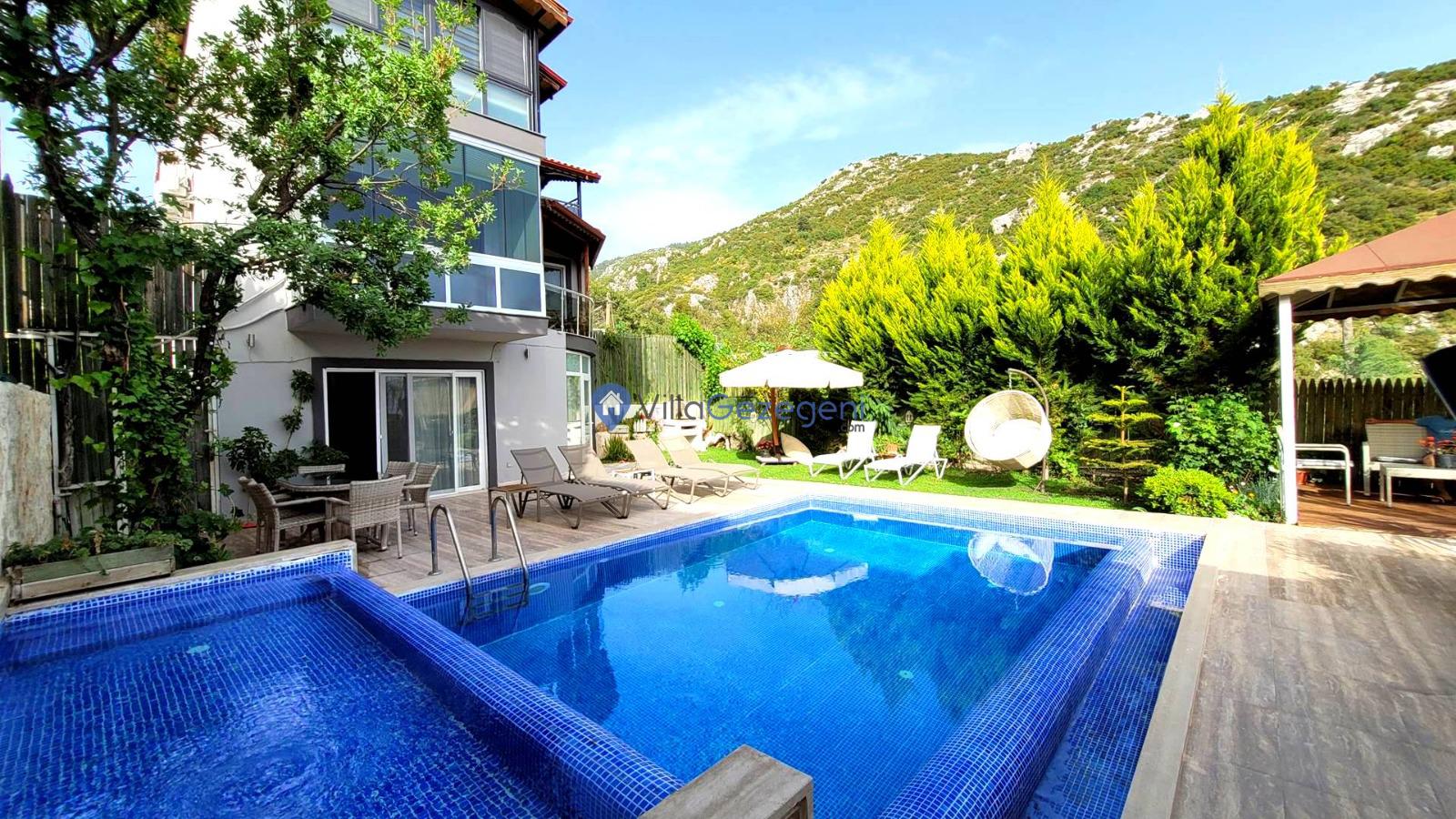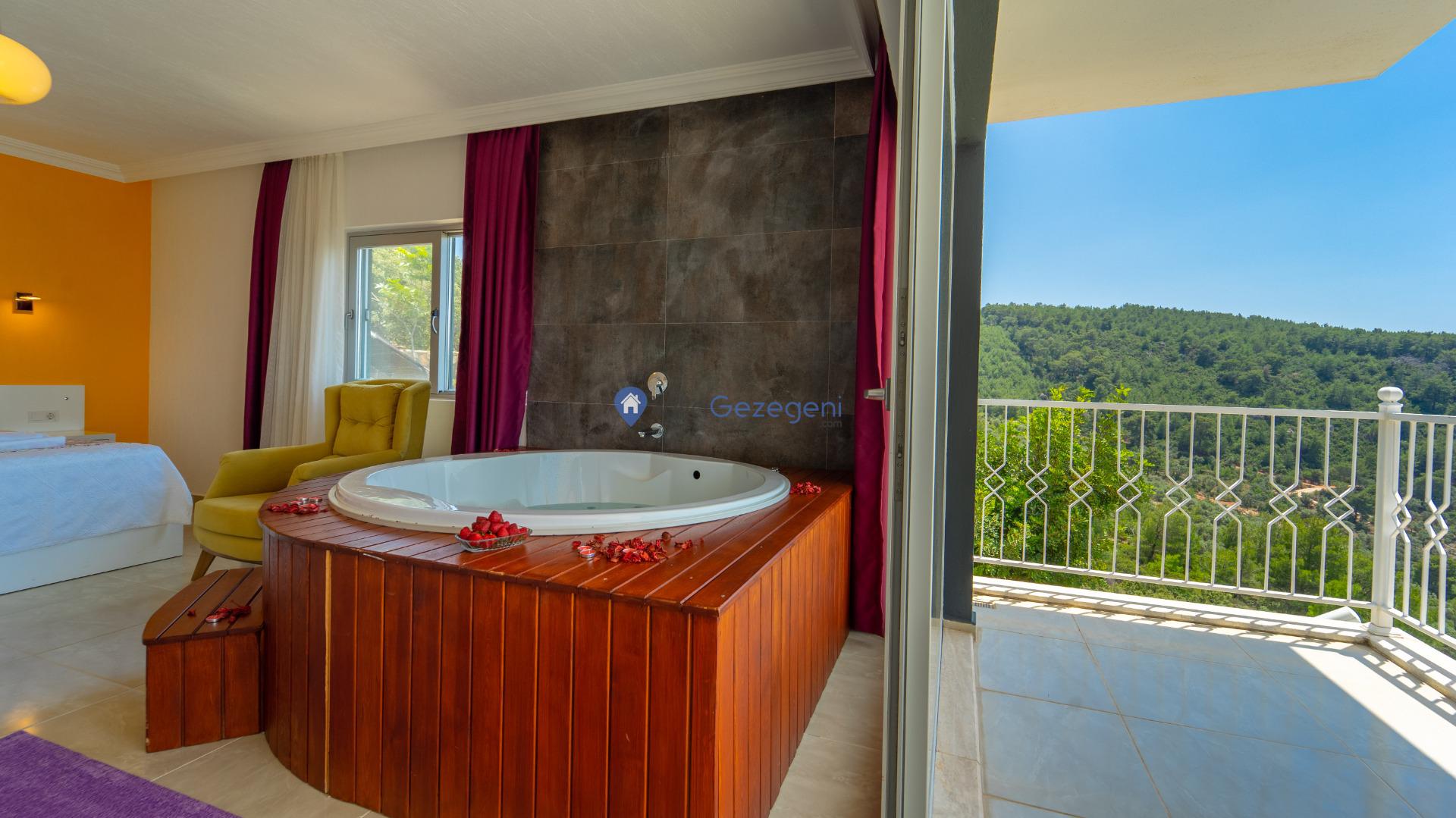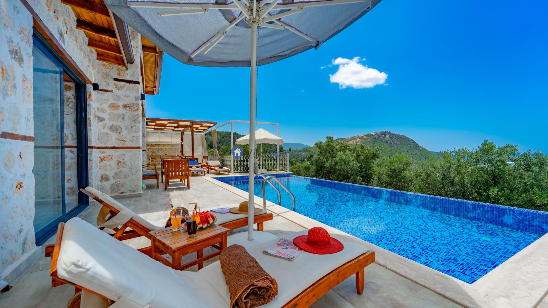 Villa Asaf, Kalkan Üzümlü'de 4 kişilik, markete merkeze ve restaurantlara yakın, jakuzili, doğa içerisinde bulunan kiralık muhafazakar balayı villası.