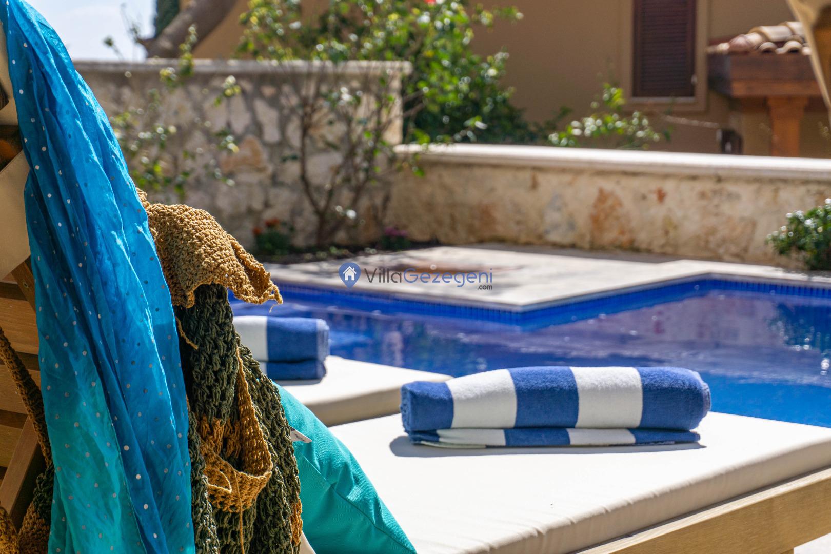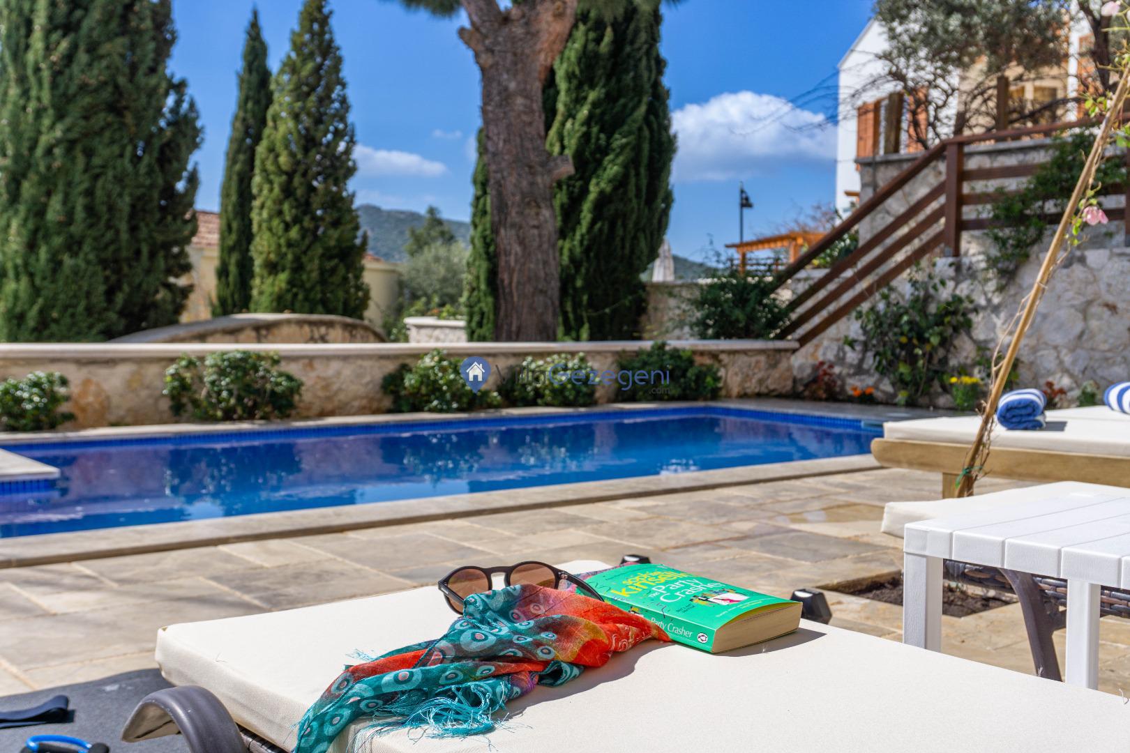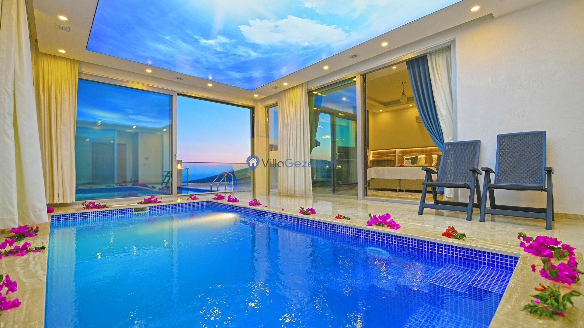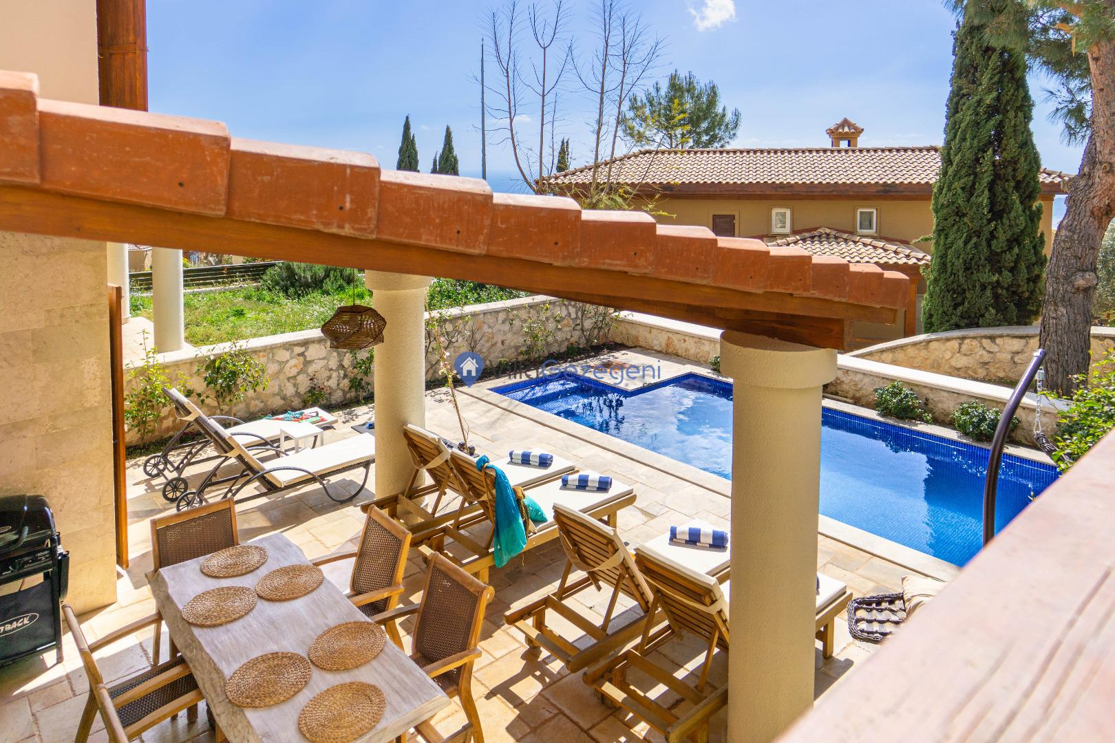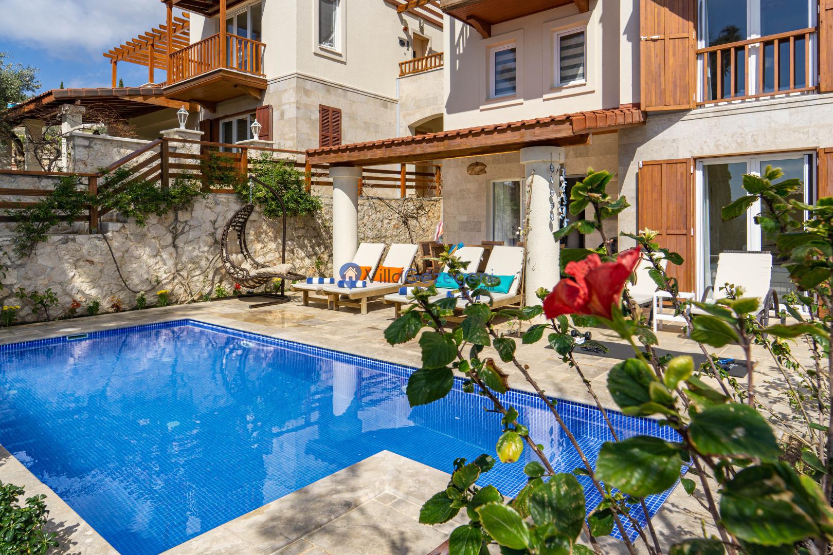 Kaş/Kalkan Lavanta bölgesinde 4 kişilik, şehir merkezine yakın, Kapalı Isıtmalı Havuzlu, doğa içerisinde, deniz manzaralı, kiralık aile ve balayı villası.