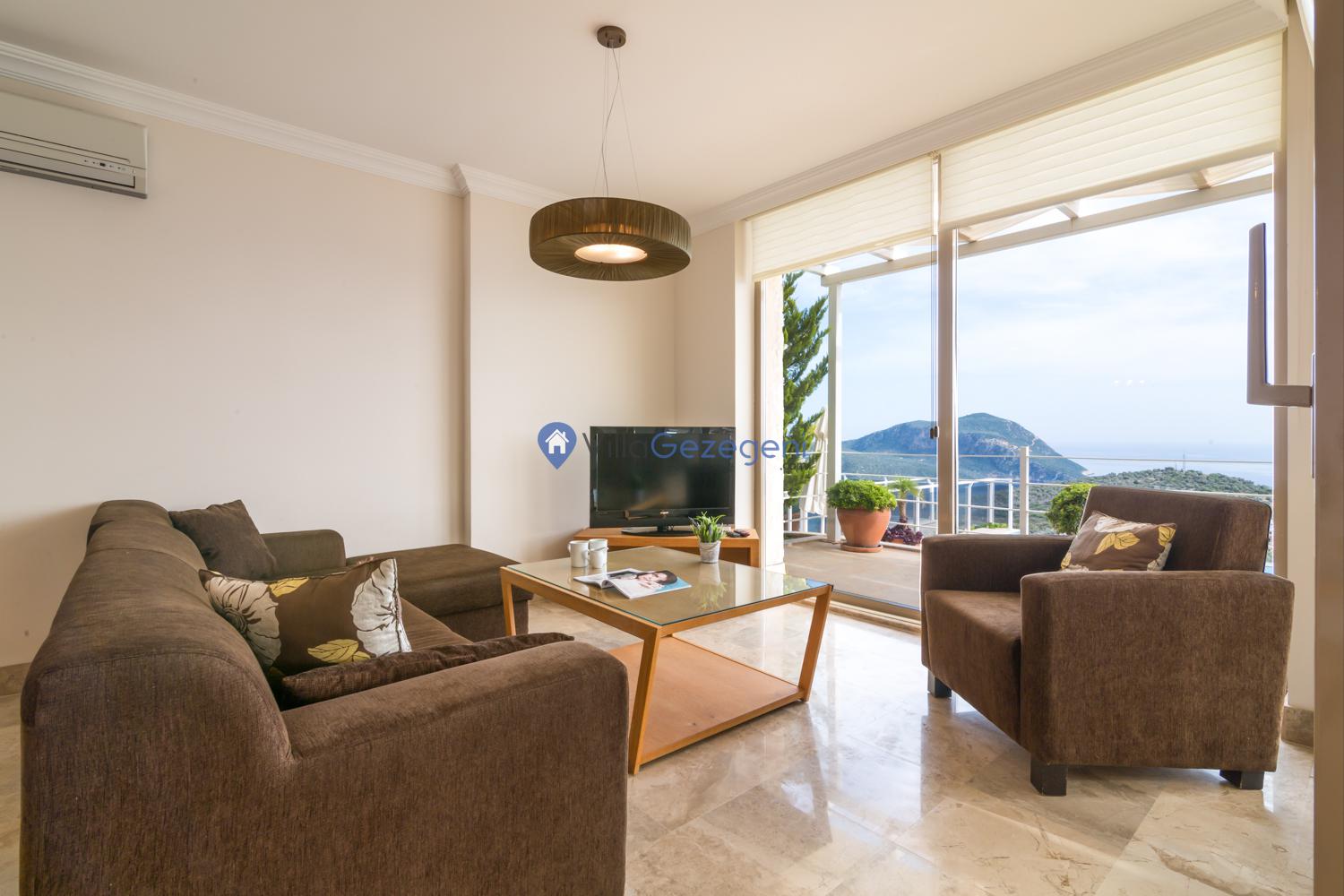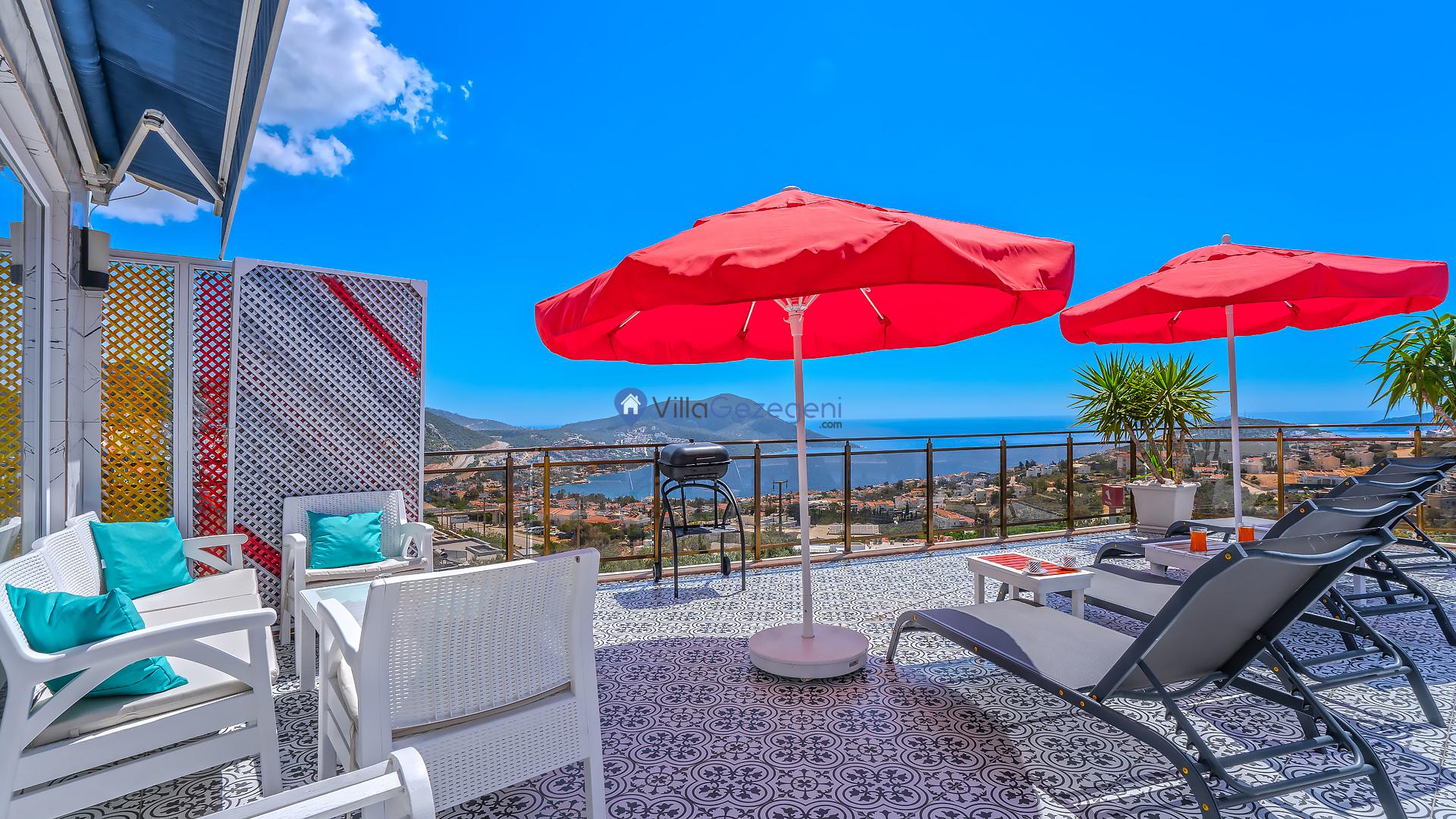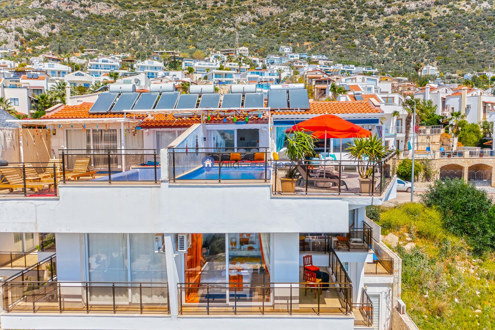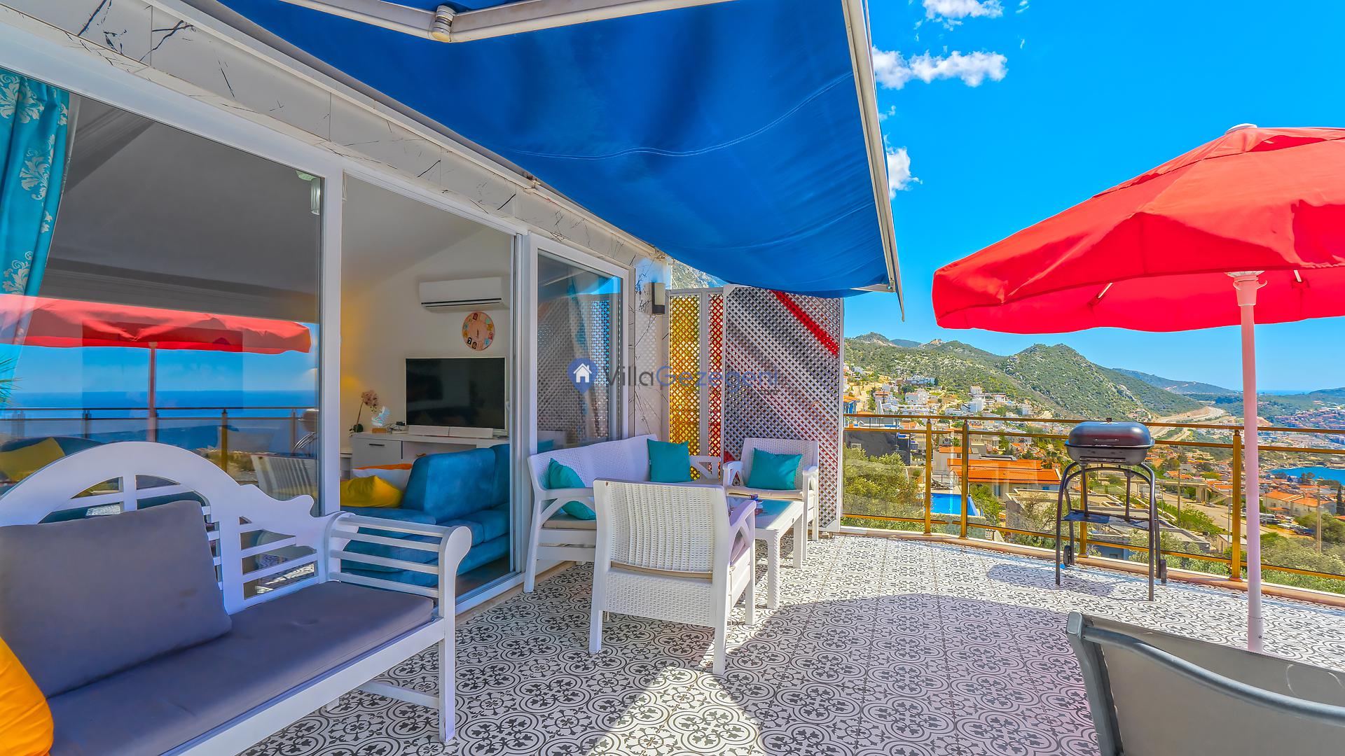 Suit Karmen, Kalkan Ortaalan'da 6 kişilik, markete ve restauranta yakın, deniz manzaralı, kiralık geniş aile ve arkadaş grupları için kiralık apart
